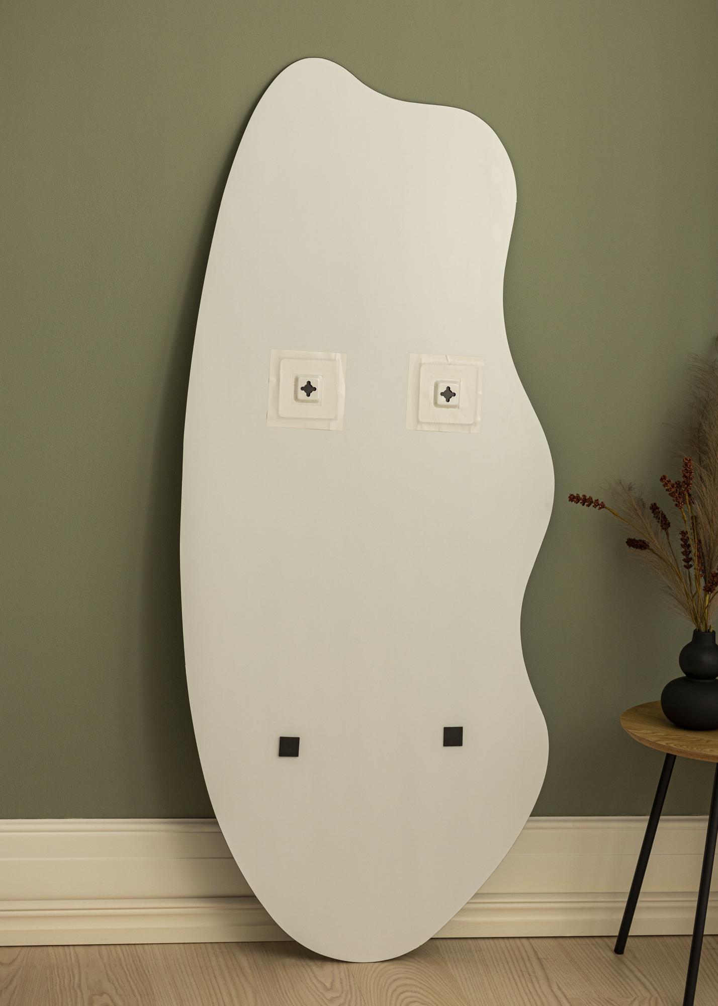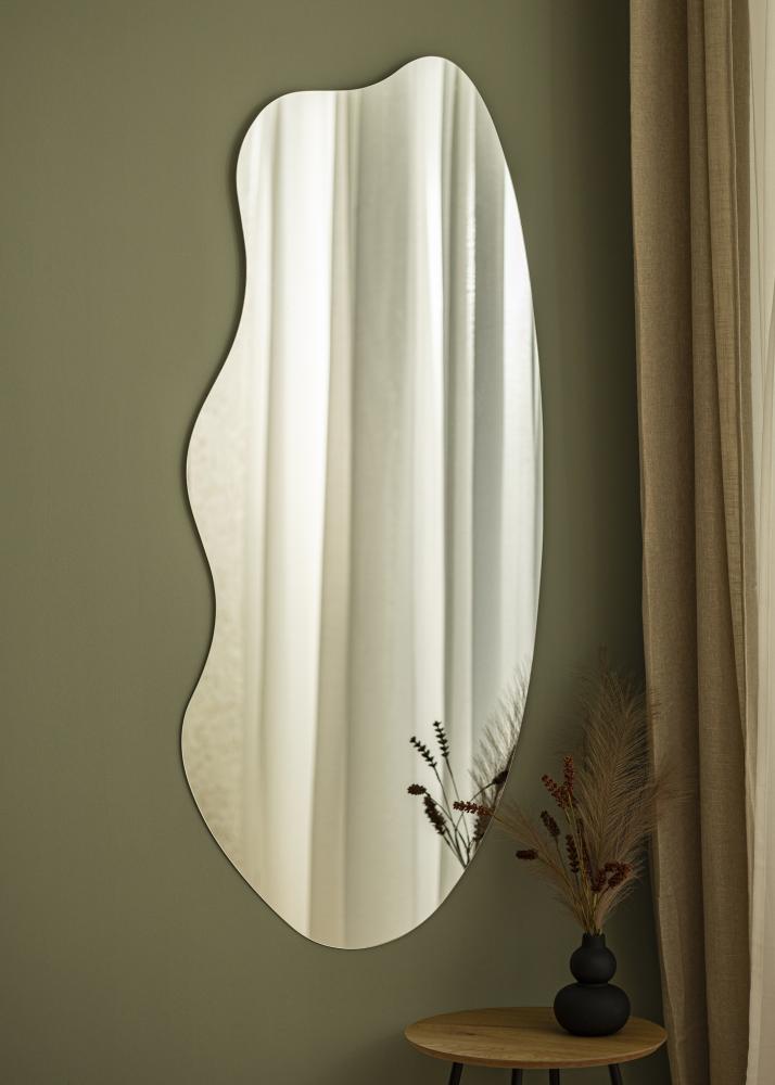 Uno specchio da parete asimmetrico diventa un elemento d'arredo accattivante in ogni casa. Questo specchio ha una forma unica, con un lato lungo arrotondato e l'altro con una forma ondulata. Insieme formano un insieme affascinante ed elegante. Lo specchio si adatta bene sia all'ingresso che al soggiorno e funziona anche come uno specchio da bagno alla moda.