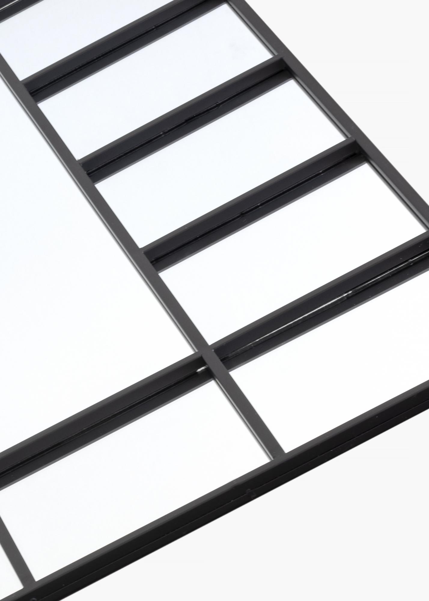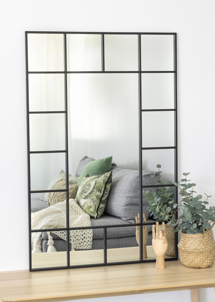 Questo bellissimo specchio di KAILA ha un design che ricorda una bella finestra. Nello specchio ci sono diversi riquadri che incorniciano elegantemente una superficie specchiata più grande al centro. I riquadri sono incorniciati da sottili linee nere in metallo che conferiscono allo specchio un carattere leggermente industriale ma allo stesso tempo elegante. È disponibile un supporto per il montaggio a parete, ma lo specchio può anche essere appoggiato elegantemente contro la parete. Lo specchio misura 80x120 cm.
