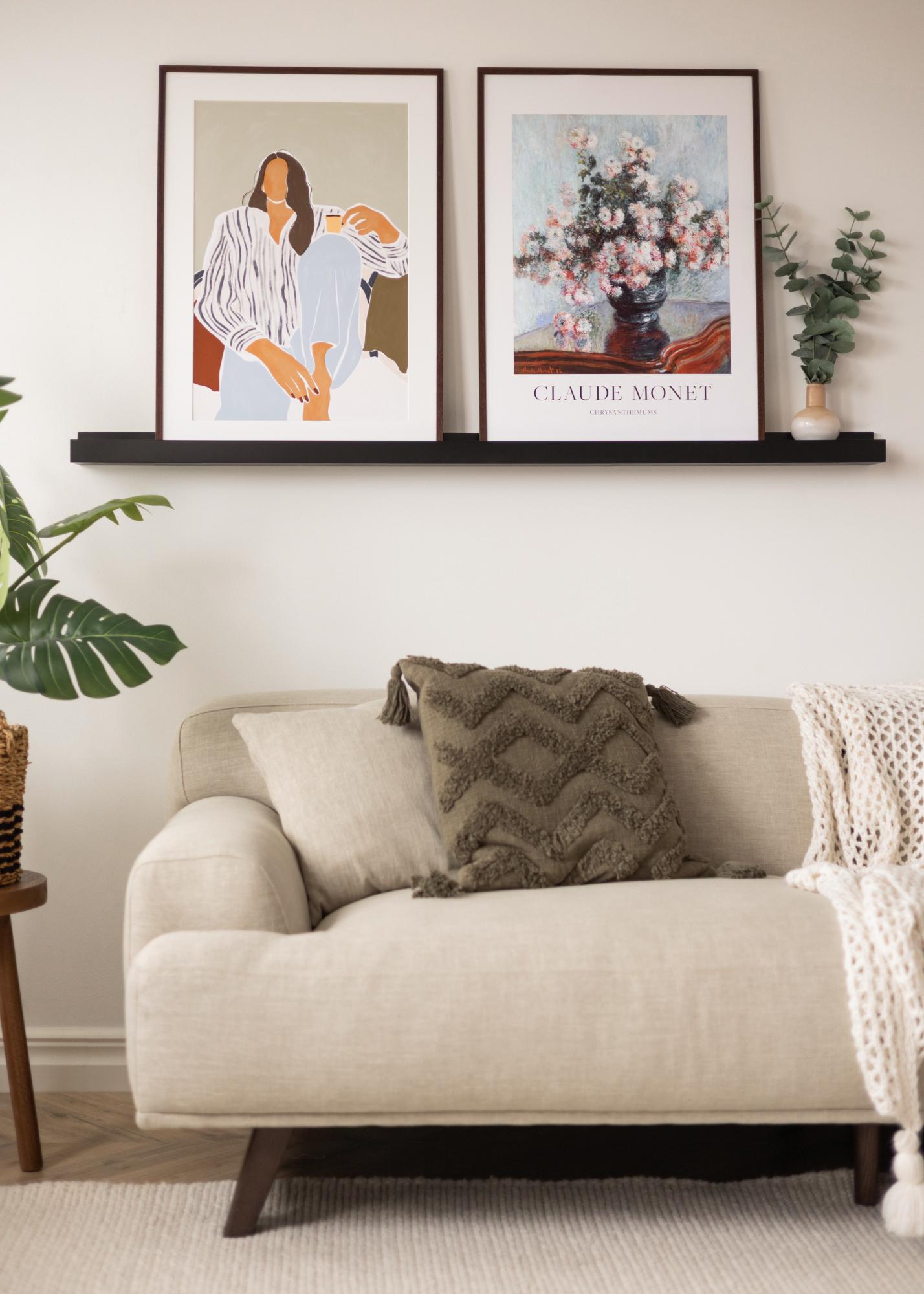 Mostra e varia la tua arte murale facilmente ed elegantemente con una mensola elegante per quadri! Questa mensola è realizzata in MDF ed è dipinta di nero, alla moda, con una bella finitura semilucida. La mensola ha un design elegante con linee dritte e semplici e una sensazione minimalista. Il ripiano ha una scanalatura fresata al centro che funge da supporto per i tuoi quadri e offre loro un bell'angolo dove appoggiano inclinati contro il muro.