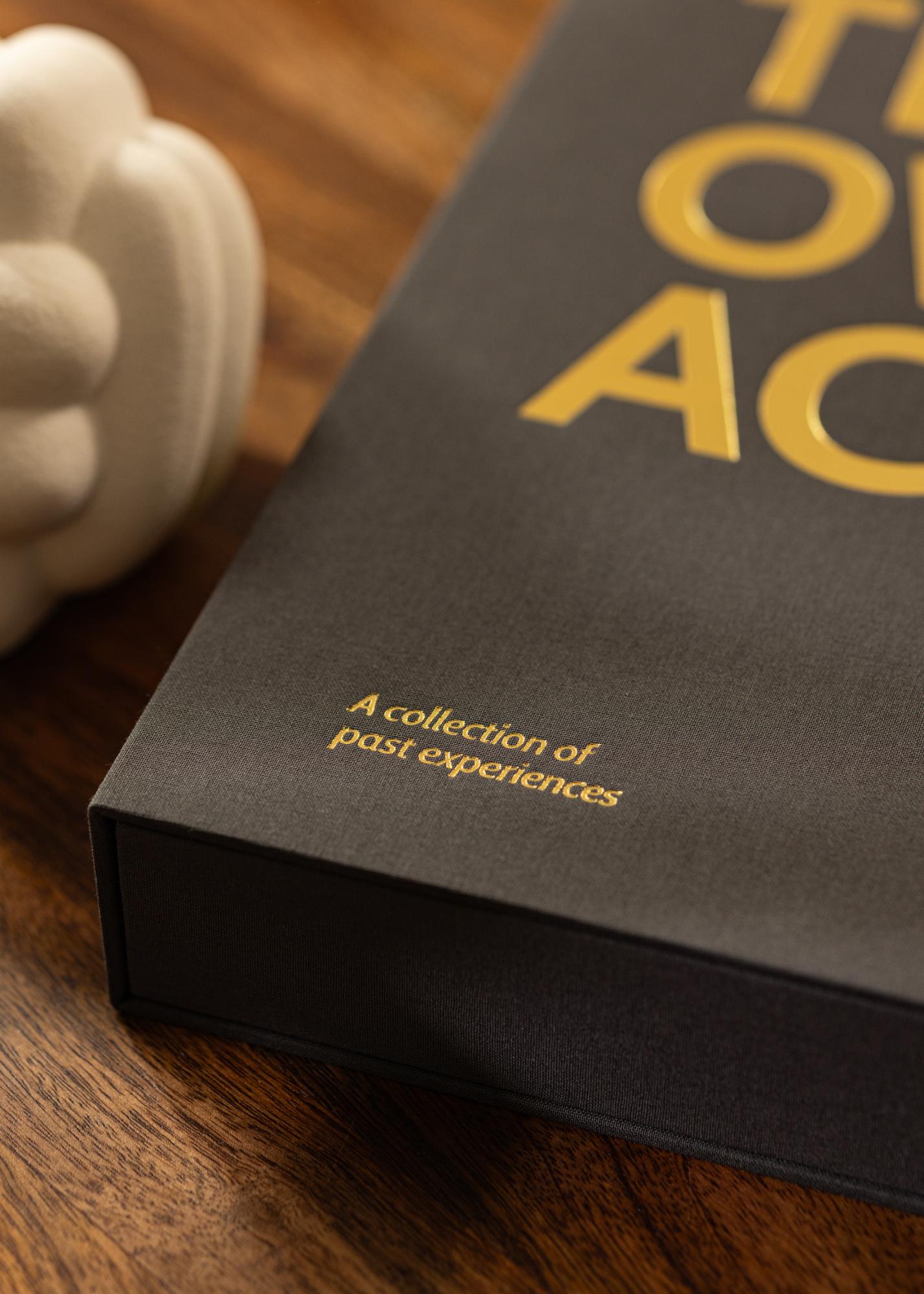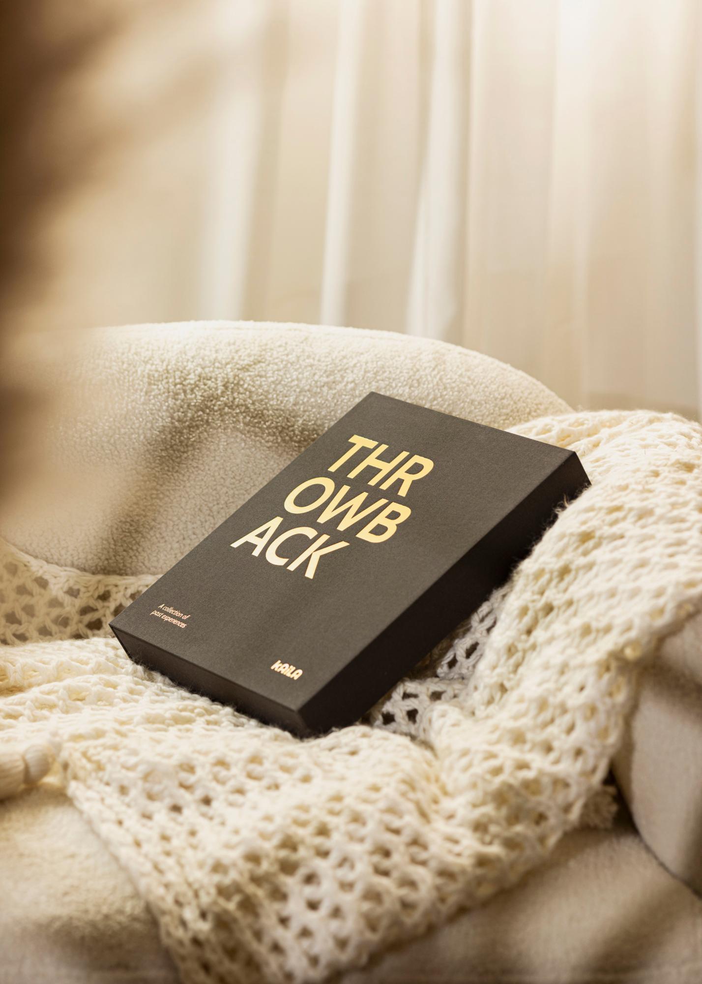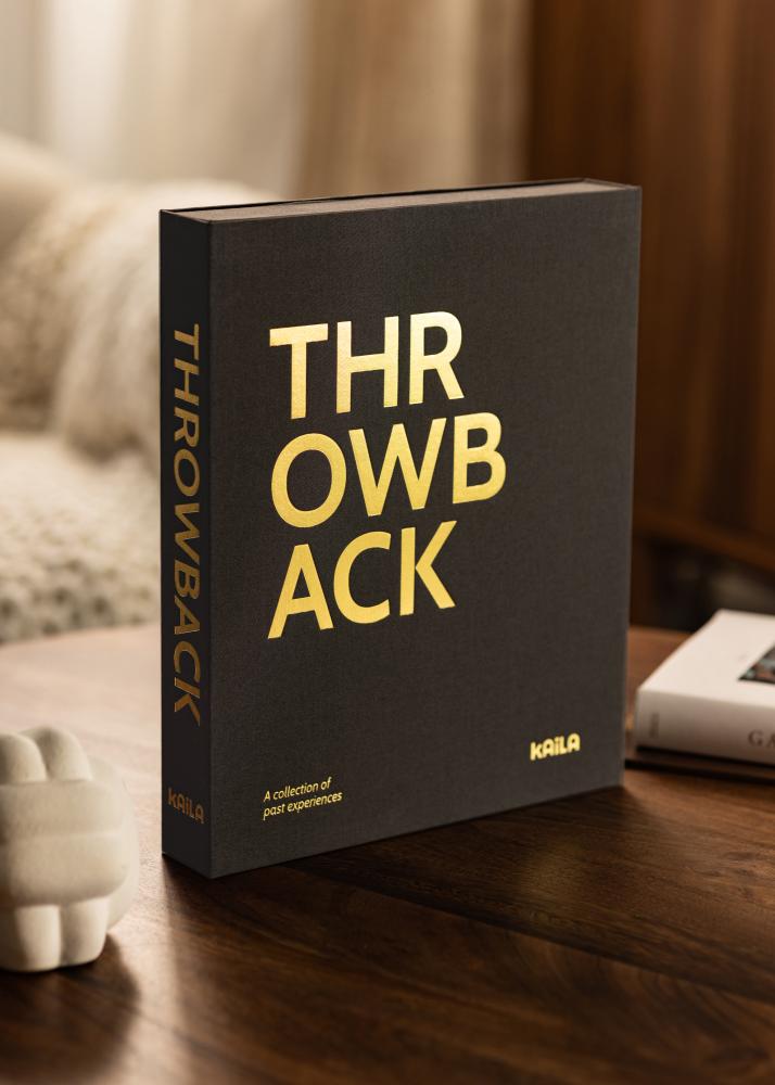 Questo è un album fotografico molto trendy, confezionato in modo lussuoso come un elegante Coffee Table Book, chiamato anche Coffee Table Photo Album. L'album fotografico è progettato come una scatola esclusiva che si apre per accedere al contenuto. La copertina è elegantemente rivestita in tessuto nero e una stampa dorata con la scritta "THROWBACK" decora sia la parte anteriore che il dorso dell'album. Questo familiare concetto di "tillbakablick" conferisce all'album fotografico un'atmosfera moderna e un po' audace, distinguendosi davvero dagli stili di album classici. L'album ha anche un sottotitolo che recita "Una collezione di esperienze passate" stampato nell'angolo in basso a sinistra.