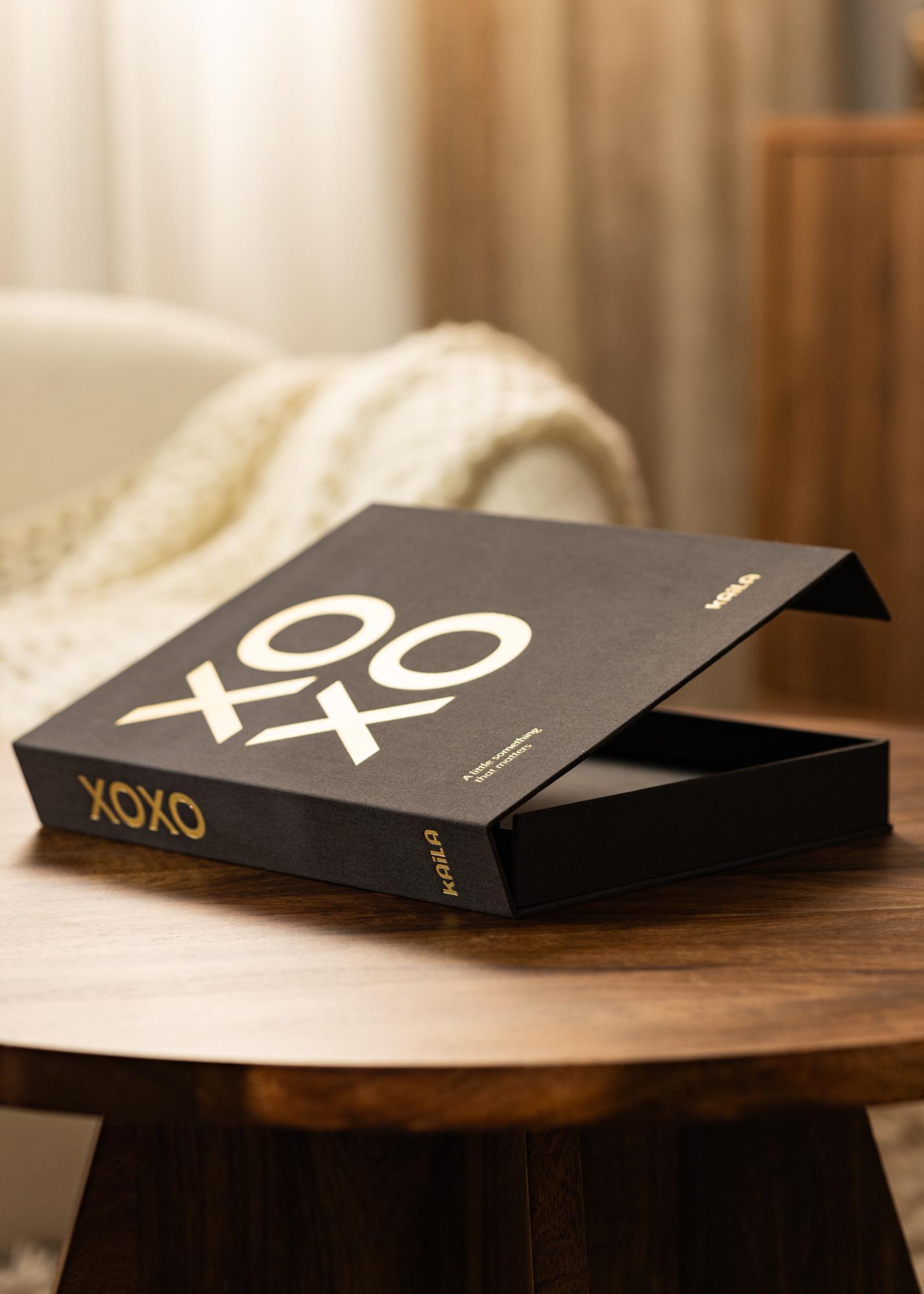 Questo elegante album fotografico è progettato come un trendy Coffee Table Book ed è quindi chiamato anche Coffee Table Photo Album. La copertina è elegantemente rivestita in tessuto nero e sulla parte anteriore e sul dorso dell'album è presente una stampa dorata con il famoso saluto di addio "XOXO", che significa baci e abbracci. Questo titolo trendy è completato anche da un sottotitolo che recita "Qualcosa di piccolo che conta" e che è stampato nell'angolo in basso a sinistra dell'album. Si tratta di un album fotografico molto elegante con un design diverso e giocoso che si distingue dalla massa.