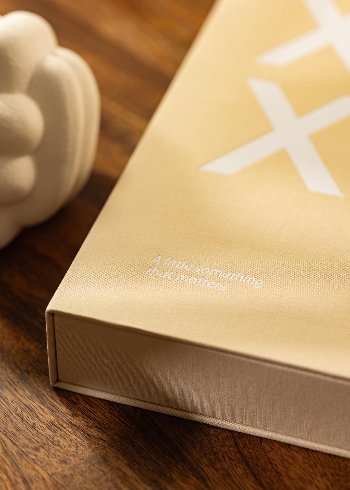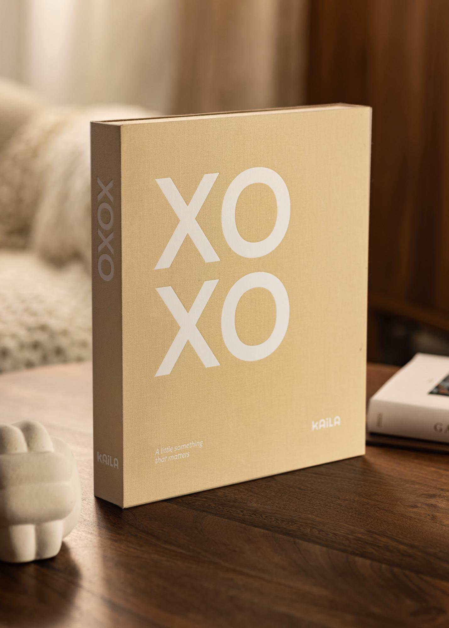 Questo elegante album fotografico è progettato come un trendy Coffee Table Book ed è anche chiamato Coffee Table Photo Album. La copertina è elegantemente rivestita in tessuto beige e sulla parte anteriore e sul dorso dell'album c'è una stampa bianca con il famoso saluto di addio "XOXO" che significa baci e abbracci. Questo titolo trendy è completato anche da un sottotitolo che recita "Qualcosa di piccolo che conta" e che è stampato nell'angolo in basso a sinistra dell'album. È un album fotografico molto elegante con un design diverso e giocoso che si distingue dalla massa.