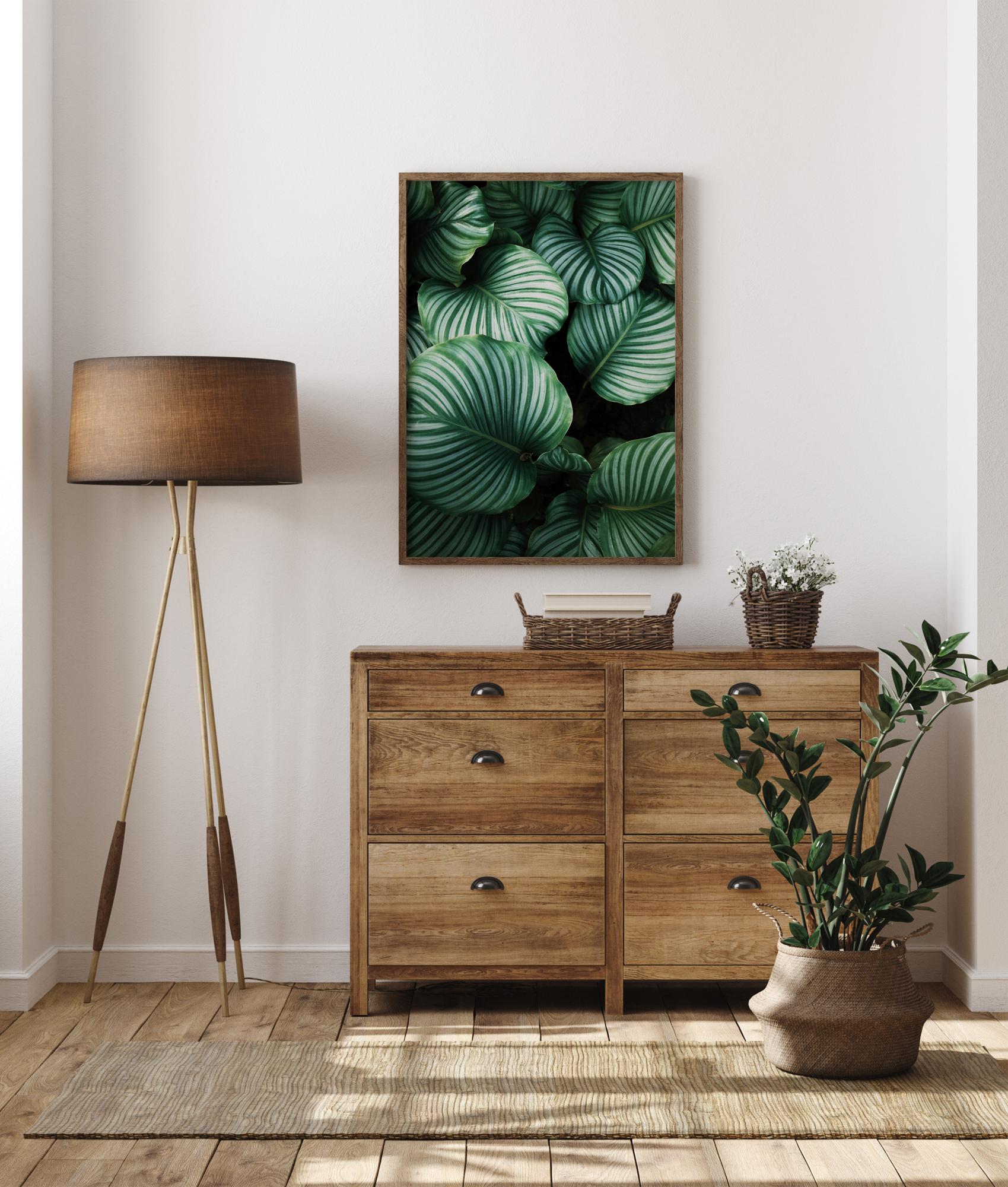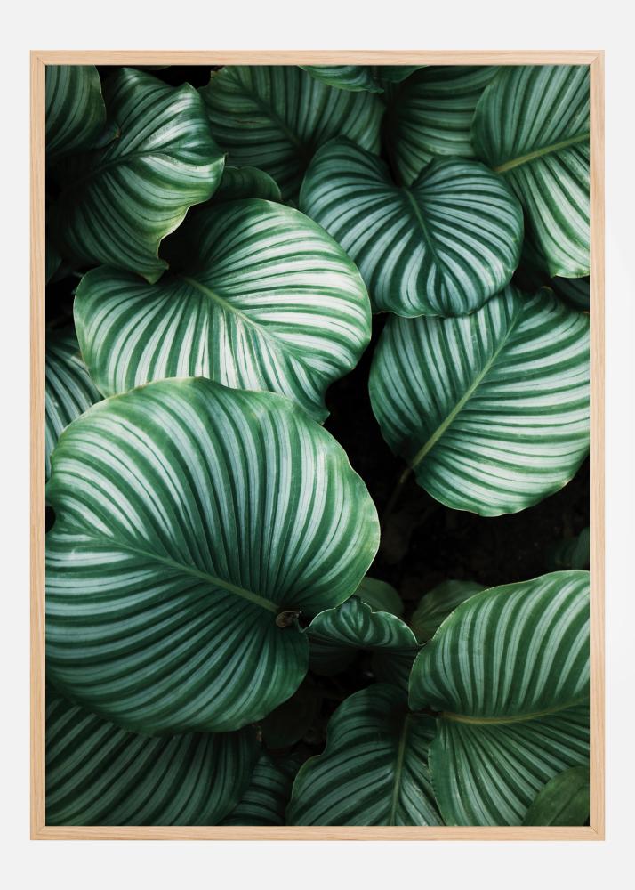Un bellissimo poster in prospettiva a volo d'uccello con foglie scure e verdi di una calathea. La luce del sole illumina le foglie creando una luce penetrante. Diverse sfumature di verde creano un ambiente intenso, rendendo questa un'immagine perfetta da appendere circondata da piante in un soggiorno.