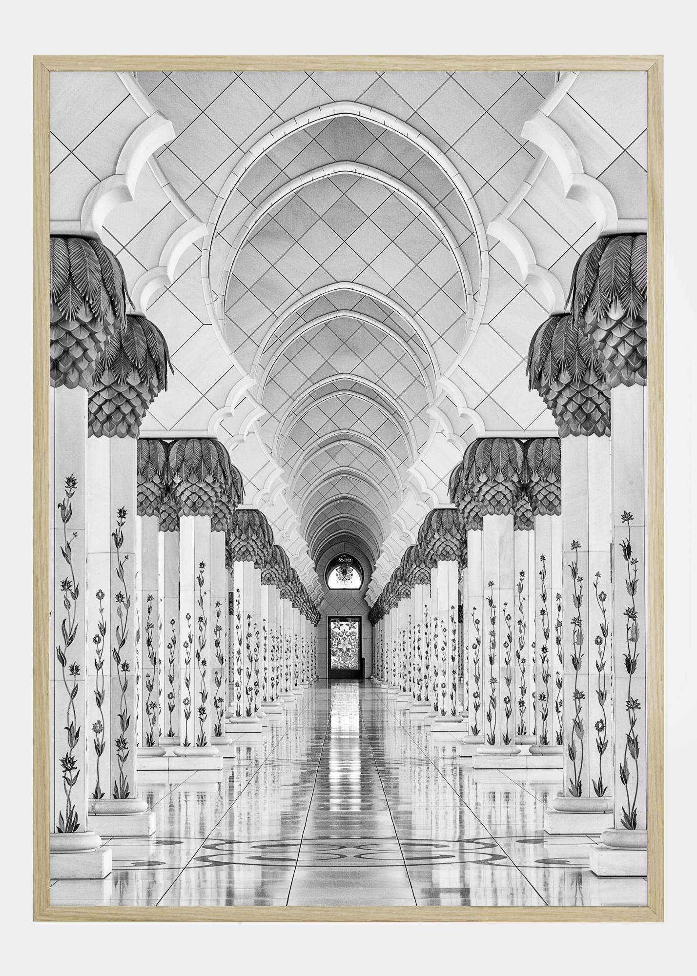 Un poster in bianco e nero che crea un'illusione di profondità. Due file di colonne conducono a una porta di vetro lontana. Le colonne sono splendidamente decorate con fiori. La luce naturale filtra attraverso la porta di vetro e crea una riflessione sul pavimento. Appendi questa stampa per creare una sensazione di spazio extra.