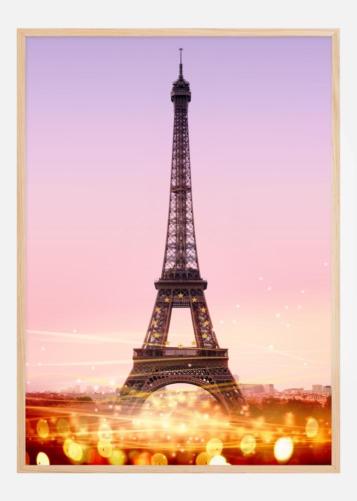 Questo poster cattura la maestosa Torre Eiffel in un crepuscolo suggestivo. I morbidi colori pastello nel cielo creano uno sfondo romantico per questo monumento iconico, mentre le luci della città sottostanti brillano come stelle, aggiungendo una sensazione di magia e oniricità. È un omaggio a Parigi, la città delle luci, e alla sua capacità di ispirare amore e meraviglia.