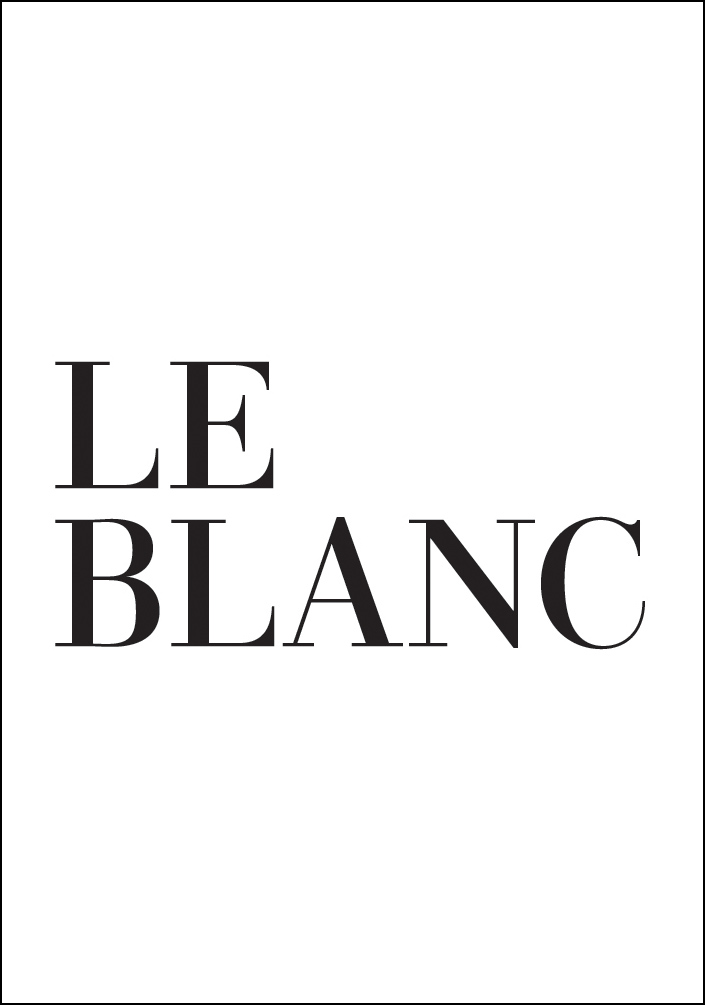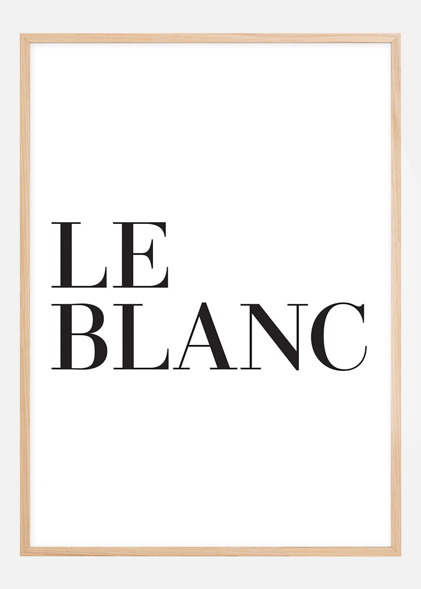 Un poster di testo semplice e elegante con il messaggio "Le blanc", Il bianco. Un poster che si adatta perfettamente aluna casa moderna e minimalista e che è perfetto da avere come parte di un collage più grande.