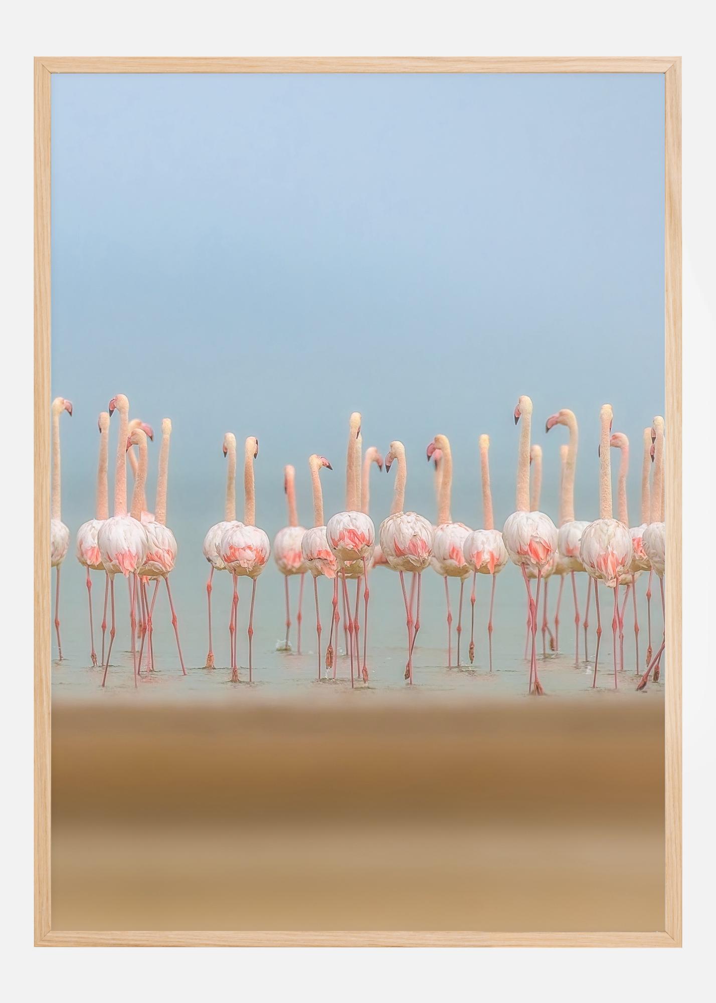Un poster spettacolare con un branco di fenicotteri sul bordo dell'acqua. Le meravigliose creature sono catturate da dietro e i loro colori sono enfatizzati dalle tonalità neutre del cielo e della sabbia. Perfetto da posizionare in una camera da letto per la sua raffinata fantasia.