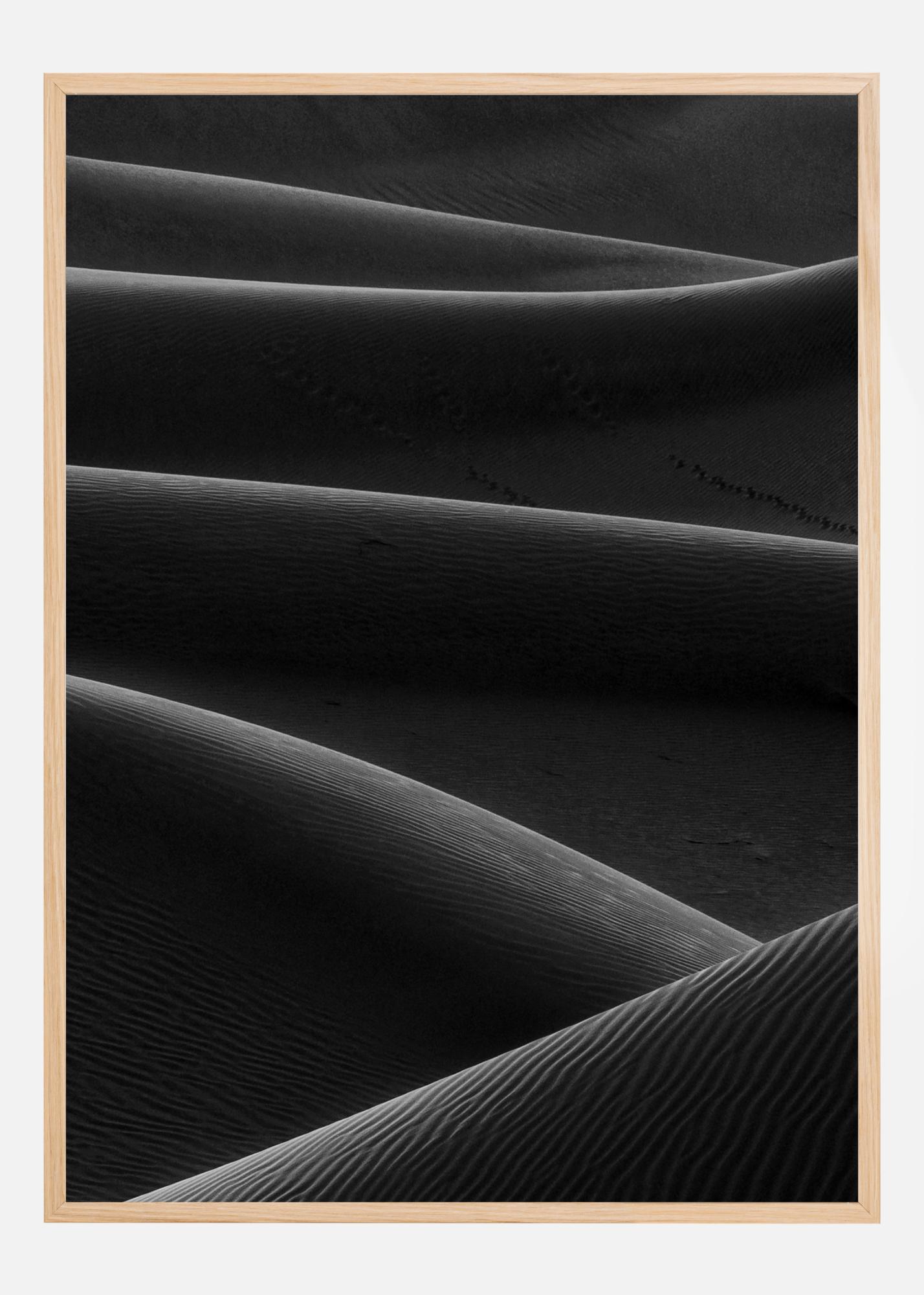 Un fantastico poster bianco e nero con dune di sabbia nel deserto. La sabbia ondulante è evidenziata dalla luce naturale che cade sulle dune di sabbia, creando un effetto di bordi. Un'immagine fantastica ma silenziosa da appendere su una parete bianca per dare una sensazione di infinito.