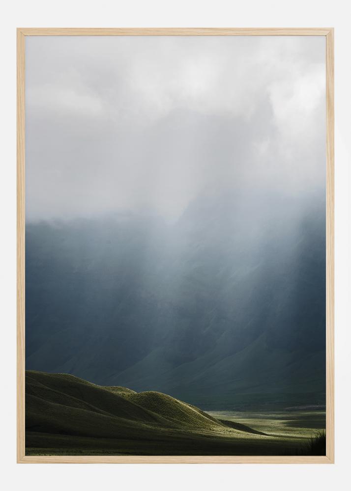 Un fantastico poster paesaggistico con le colline verde scuro in primo piano. Le alte colline dall'altro lato sono appena visibili a causa della nebbia mattutina. I colori verdi e grigi morbidi creano una sensazione di tranquillità e relax. Una stampa perfetta da appendere in un soggiorno.