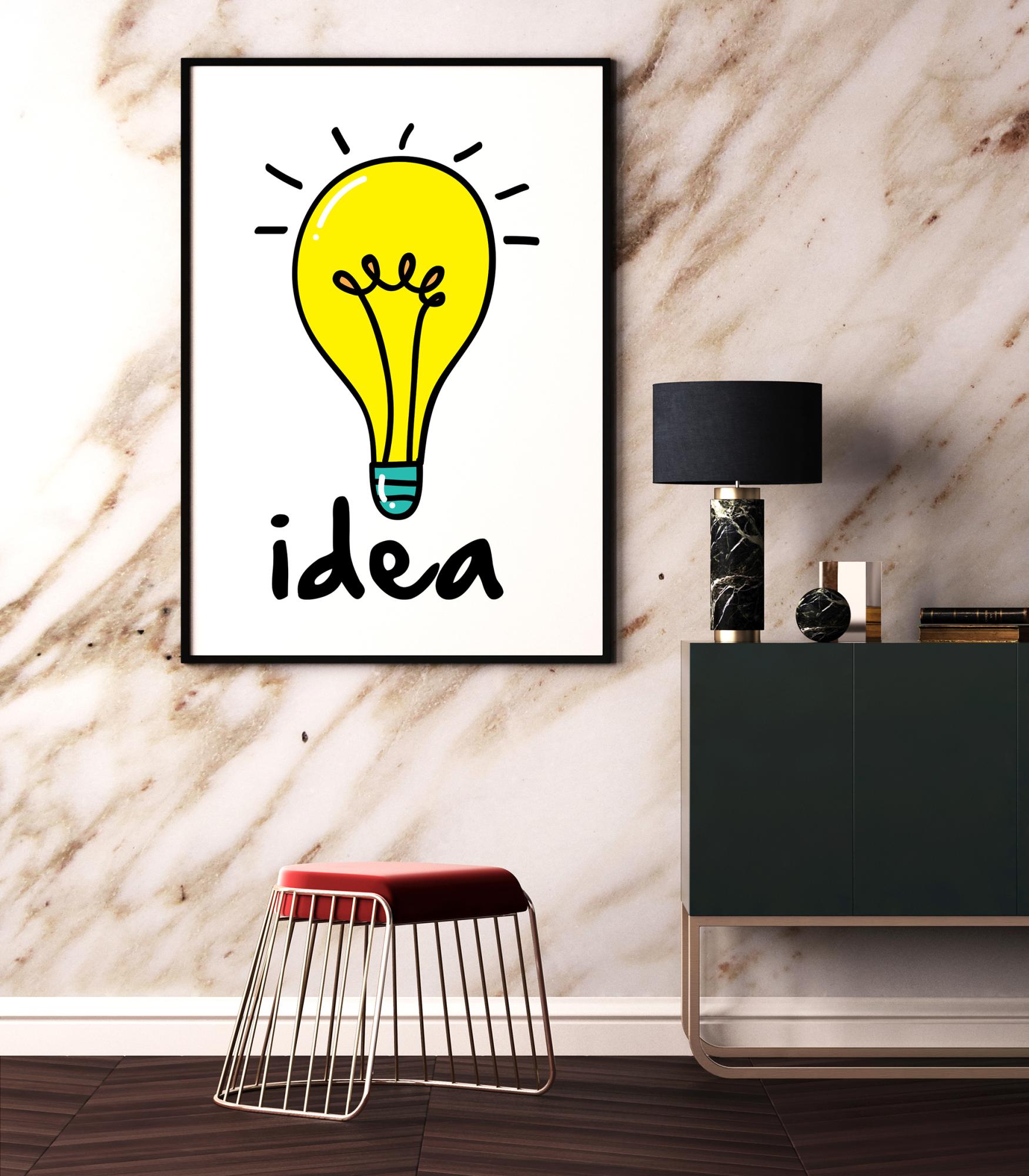 Conosci qualcuno che è sempre pieno di idee pazze? Ecco il regalo perfetto da dare al genio. Il poster, con un'illustrazione di una lampadina accesa e la parola "idea" in inglese, ha un'atmosfera da fumetto e si adatta bene ad essere appeso insieme ad altre stampe grafiche dello stesso stile. Completa il poster con una bella cornice nera con un profilo più sottile che mette in risalto l'immagine e rafforza la sensazione naïve dell'immagine.