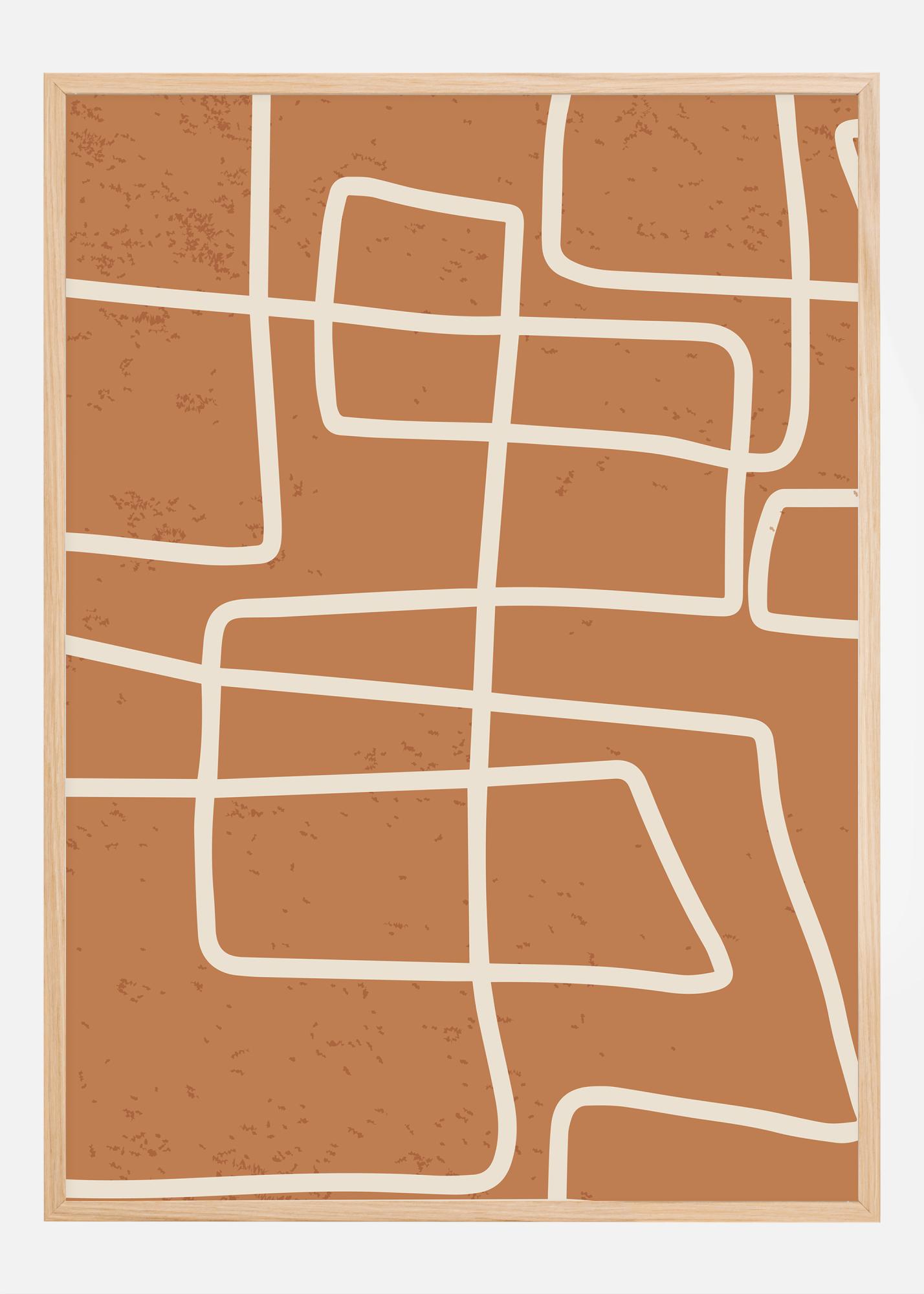Questo poster minimalista e elegante presenta una rete di linee pulite che formano una sorta di mappa astratta o un paesaggio cubista. Le linee beige attraversano uno sfondo color terracotta caldo e creano una sensazione di ordine e struttura su una tela morbidamente strutturata. Questa è una stampa che si adatta perfettamente a chi apprezza il design moderno e lo spettro cromatico più caldo nella propria casa o ufficio.