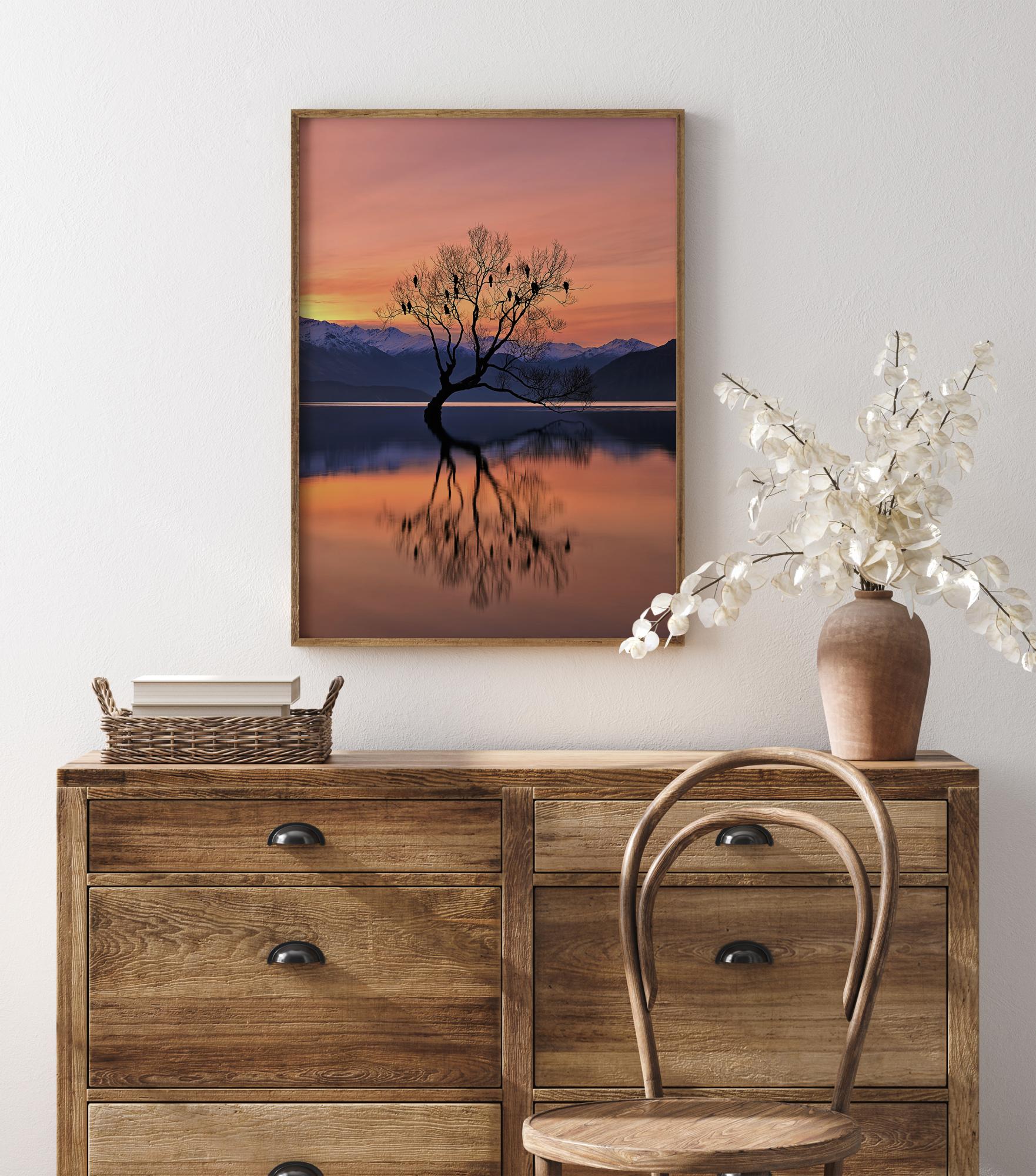 Un bellissimo poster naturalistico con un albero solitario al centro di un lago. Con gli uccelli che si posano tranquillamente sui rami, questa stampa dai colori pastello riflette l'albero nel lago, creando un perfetto effetto specchio sia della natura che dei colori. Ascolta il silenzio in questa immagine rassicurante.