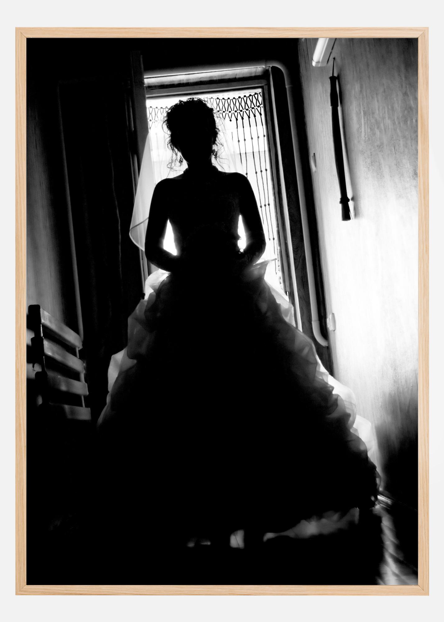 Arte fotografica in scala di grigi scura di una sposa fotografata contro la luce. Un poster scuro e sfocato che crea interesse e curiosità. Combinalo con altri preferiti per una parete d'arte più grande e vivace.