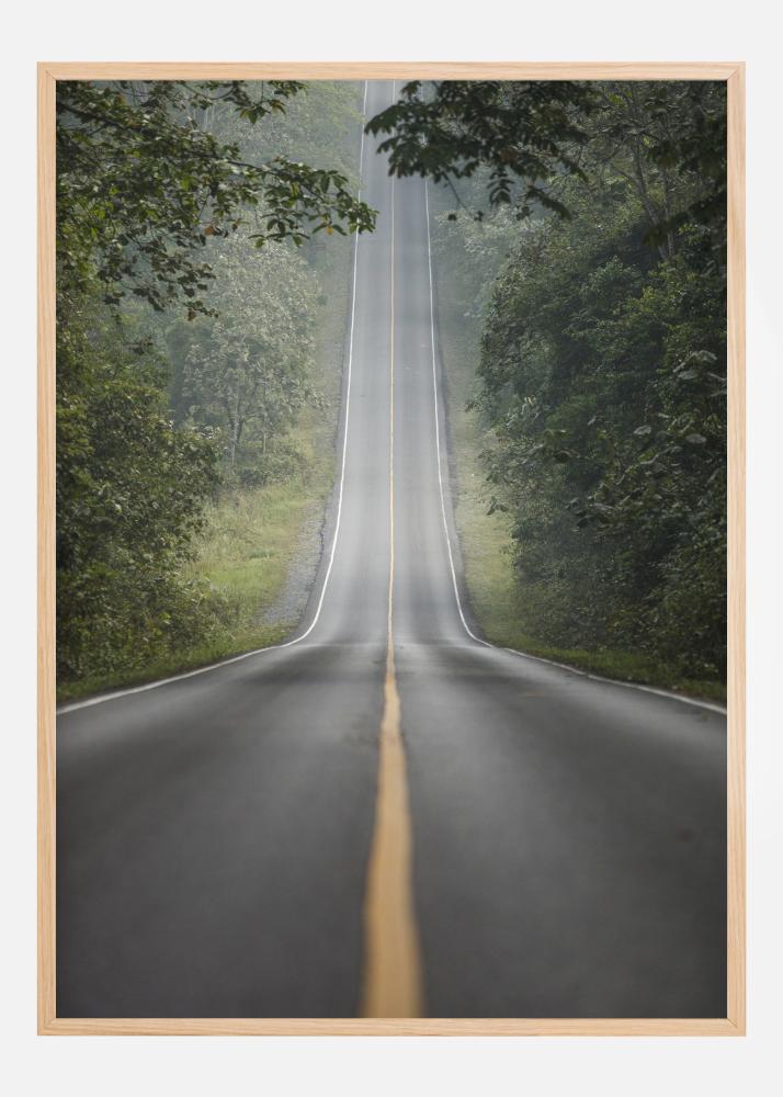 Una bellissima stampa naturale di una strada solitaria che si snoda nel bel mezzo della foresta. La lunga strada rettilinea attraversa direttamente il centro della foresta verde e accentua la linea gialla al centro dell'immagine. Un semplice poster che ti fa chiedere dove questa lunga strada grigia ti porterà.