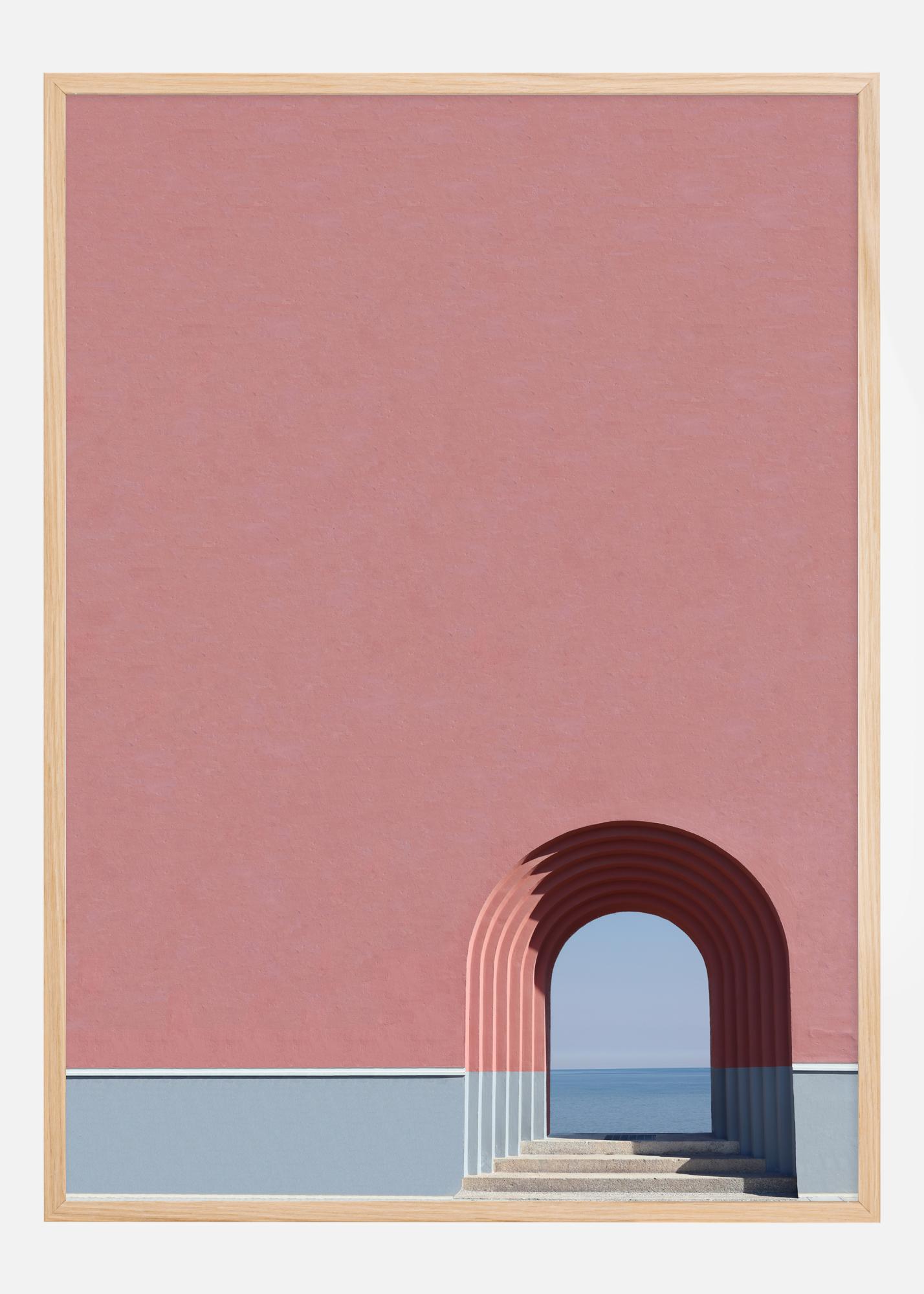 Questo poster intitolato "Look the Ocean" invita alla contemplazione attraverso il suo design semplice e pulito. L'immagine esalta un sereno arco architettonico che si apre verso l'orizzonte infinito del mare. Il motivo gioca con il contrasto tra la morbida tonalità rosa del muro e il calmo mare blu, creando una sensazione di pace e armonia.