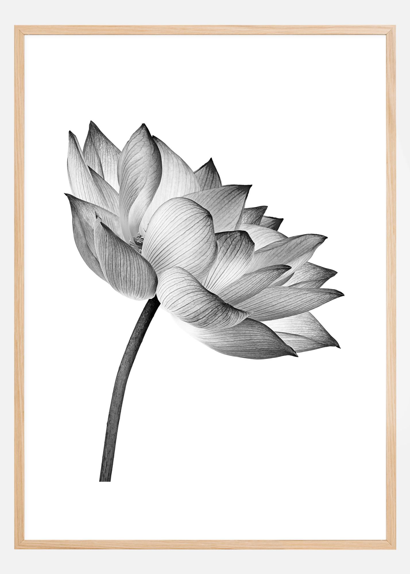 Un poster grafico in bianco e nero di un fiore di loto su uno sfondo bianco. Un poster elegante e minimalista che è facile da combinare con altri preferiti in una grande parete di quadri.