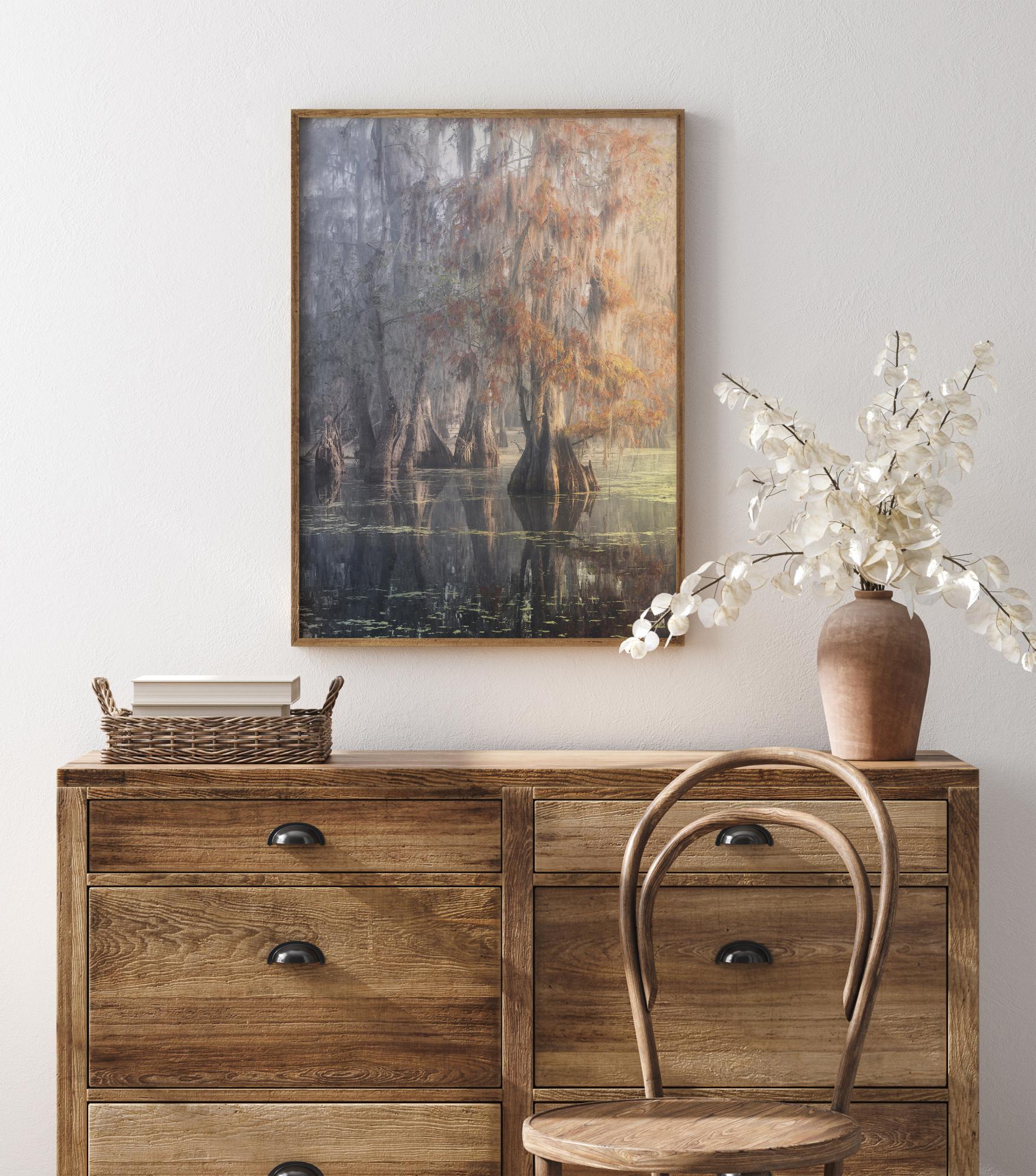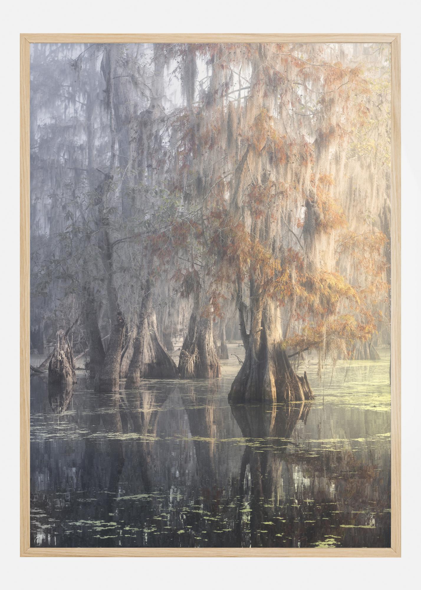 Un poster mozzafiato con una palude in Louisiana. Un'immagine eccezionalmente tranquilla di una palude con acqua calma. La luce naturale crea riflessi perfetti nella palude e crea una sensazione di tranquillità. Porta la natura nella tua casa con le bellissime tonalità verdi e marroni di questa stampa.