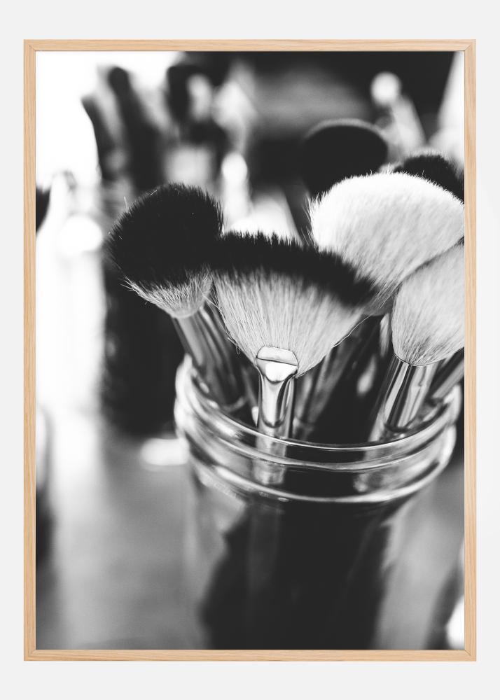 Una stampa artistica ma divertente di un barattolo di vetro pieno di pennelli per il trucco. Questo poster in bianco e nero sorprendente mostra diversi pennelli di diverse dimensioni. Senti quanto sono morbidi questi pennelli quando appendi questa stampa sulla parete della tua camera da letto.