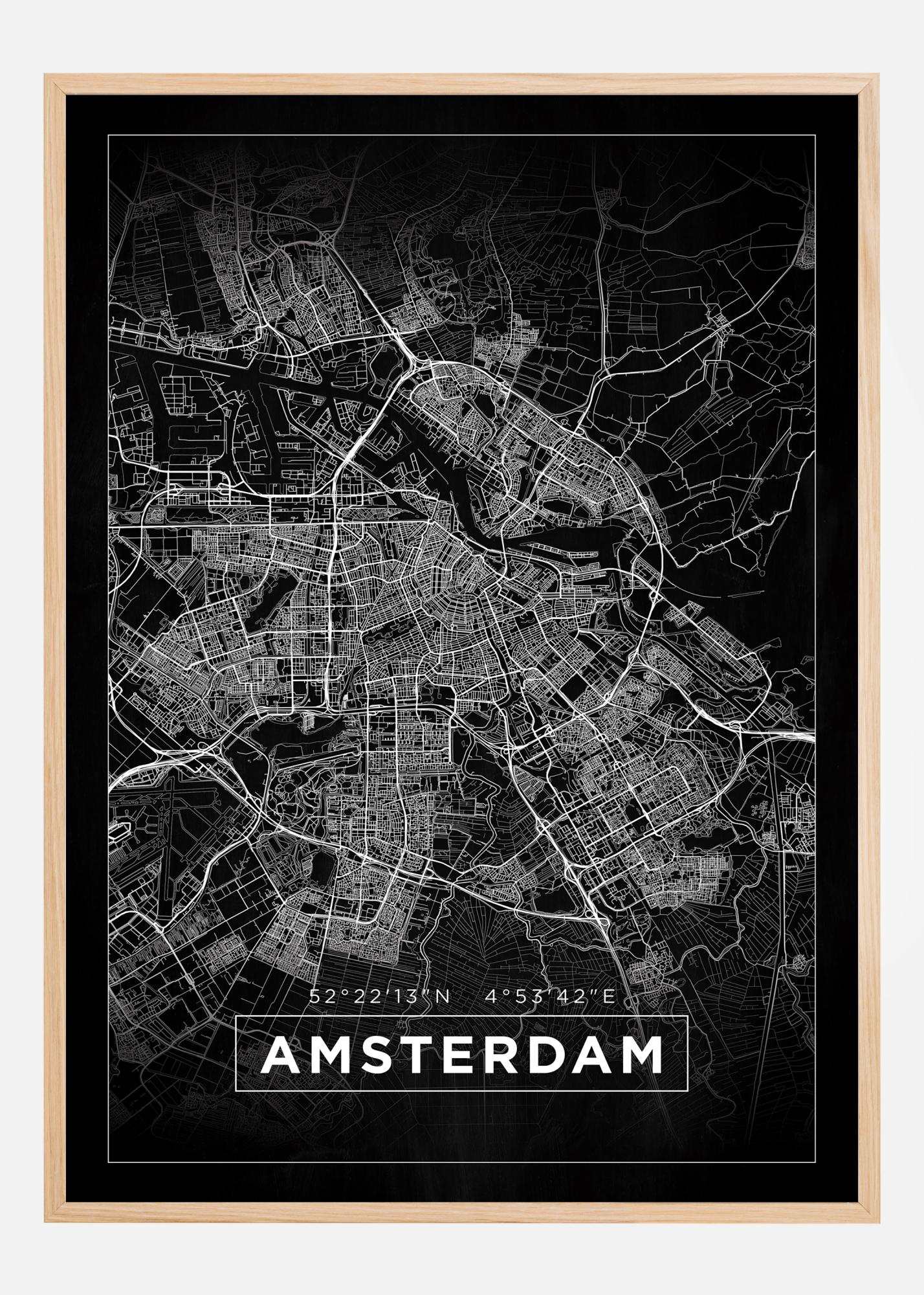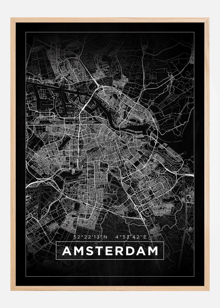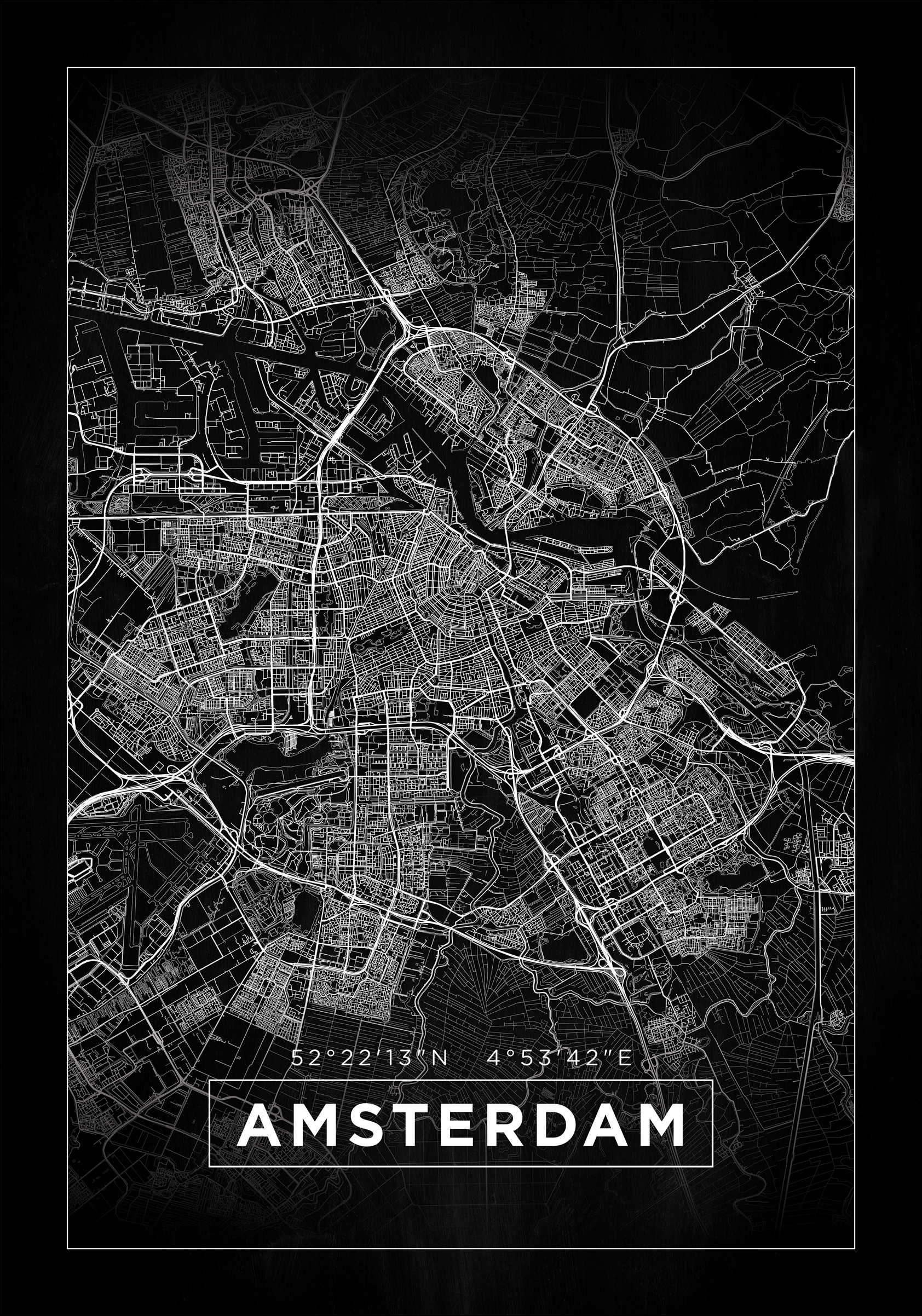 Ecco un bellissimo poster della mappa della città del cuore dei Paesi Bassi, Amsterdam. In bianco su nero, questa mappa della città crea un vero e proprio punto focale che conferisce alla tua città preferita quel tocco in più dalla sua posizione sul muro. In formato verticale, la città si estende nella sua grande griglia minimale di strade e piazze. In alto e in basso, la mappa sfuma e viene circondata da una cornice più sottile in bianco e poi da un margine più ampio in nero. Nella parte inferiore della mappa, Amsterdam è scritta in grandi lettere bianche, incorniciata da una cornice identica a quella della mappa nel suo complesso e sopra di essa sono indicate le coordinate della città. Aggiungi una bella cornice e avrai il regalo perfetto per te stesso o per qualcun altro che ami Amsterdam!