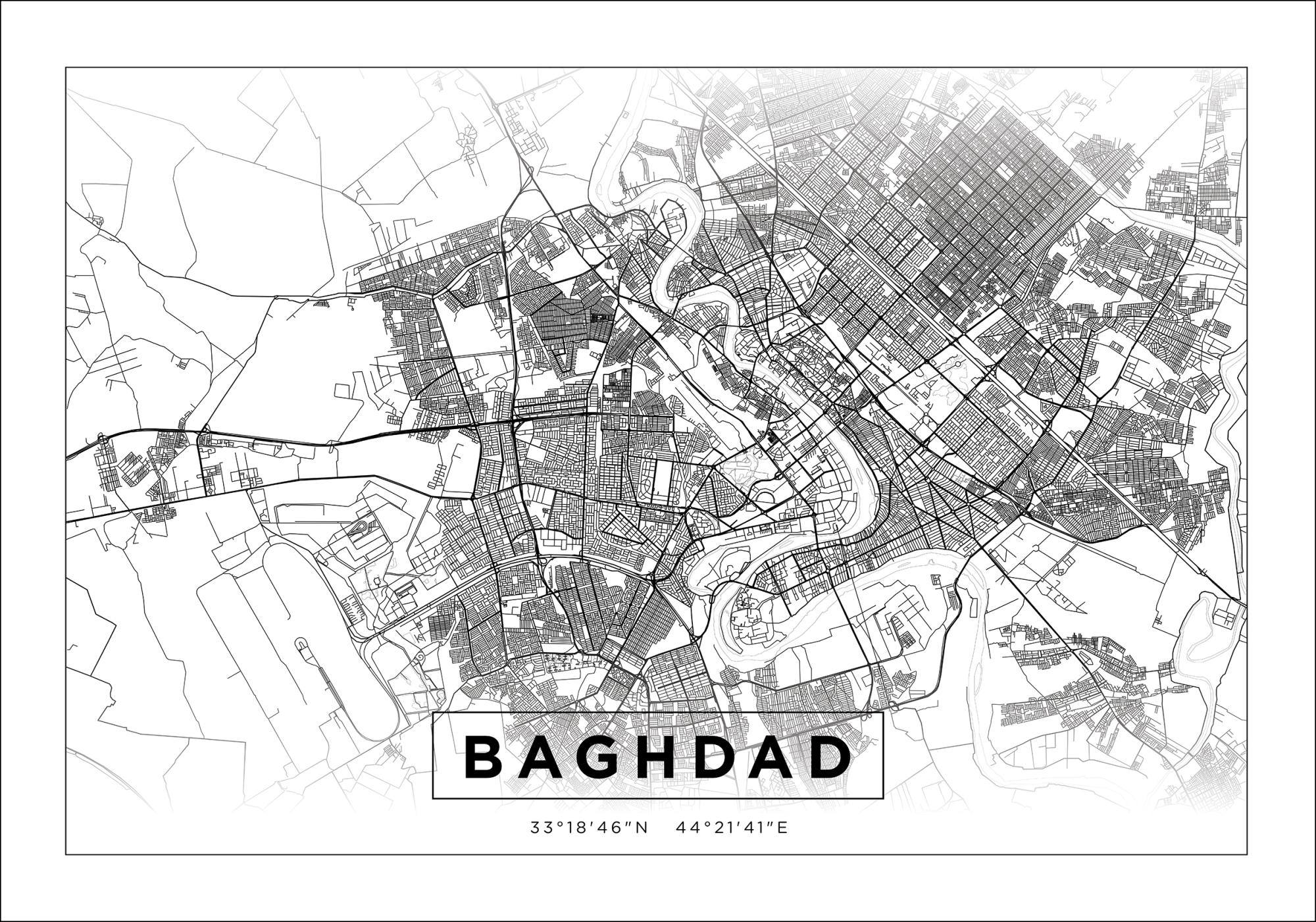 Ecco un classico e elegante poster della mappa di Baghdad in formato orizzontale. In una griglia minima, le strade e le piazze della città sono incise in nero su uno sfondo bianco. A nord e a sud, la mappa della città sfuma e viene incorniciata da una sottile linea nera. In basso nell'immagine della mappa, "Baghdad" è stampato in lettere maiuscole e sotto di esso le coordinate della città. La cornice della mappa si trova nello stesso stile intorno al nome della città e l'intera immagine è circondata da un ampio margine bianco che guida lo sguardo verso il motivo del poster. Un poster della mappa elegante e di stile che si adatta a tutte le stanze della casa!