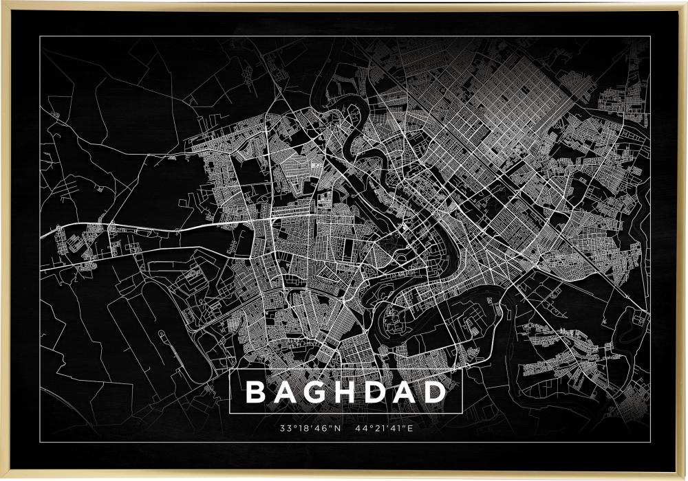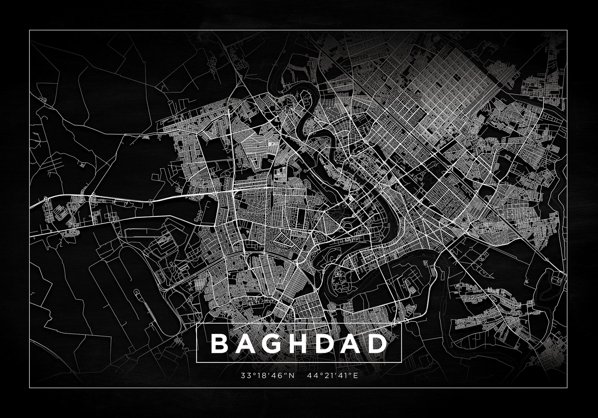 Qui Baghdad si estende in un formato orizzontale. Con un aspetto che può essere paragonato a un negativo, le strade di questa mappa poster si snodano in bianco su sfondo nero. La mappa della città sfuma in alto e in basso ed è incorniciata da una sottile linea bianca che a sua volta è circondata da un ampio margine nero. Al centro in basso dell'immagine, Baghdad è scritto in lettere maiuscole, anch'esso incorniciato da una sottile linea bianca nello stesso stile della mappa della città. Tra la cornice di Baghdad e la cornice della mappa sono indicate le coordinate della città. Un poster davvero elegante con un aspetto fuori dal comune!