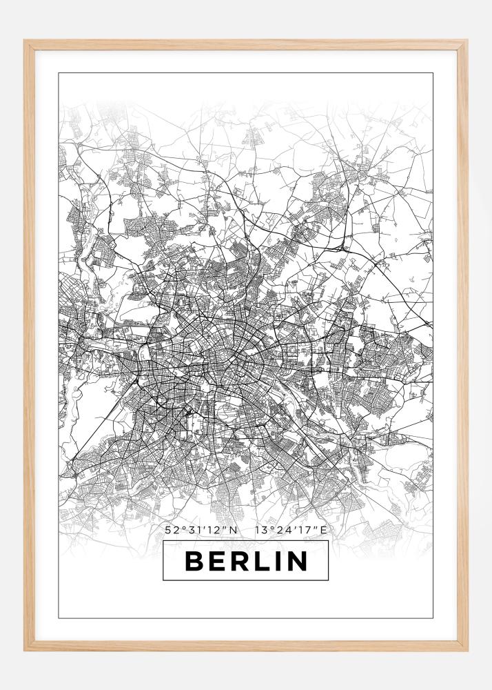 Qui vediamo il cuore della Germania espandersi come un fiore in bianco e nero. Una mappa poster in formato verticale che mostra l'intera rete stradale di Berlino incorniciando tutte le strade e le piazze della città. In alto e in basso nell'immagine, tutte le linee nere della mappa della città sfumano nel bianco e sono circondate da una sottile cornice nera. In basso nella mappa è scritto "Berlino" in lettere maiuscole e sopra di essa le coordinate della città; Berlino incorniciato come la mappa stessa. L'immagine è circondata da un margine bianco leggermente più ampio che cattura lo sguardo sul suo contenuto in modo elegante. Un poster di mappa elegante e raffinato che può decorare facilmente qualsiasi parete!