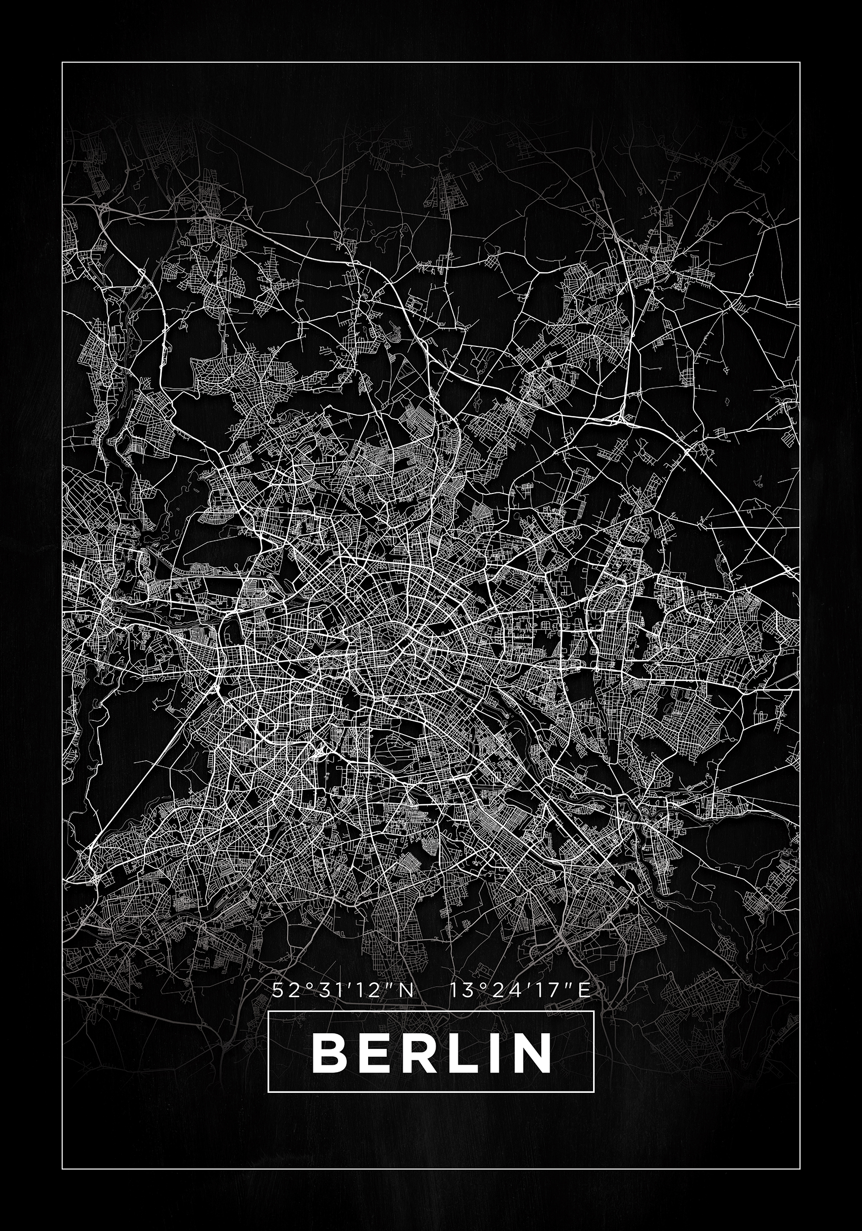 Se si cerca un omaggio a Berlino, questa è un'alternativa perfetta! Con strade e piazze in bianco su sfondo nero, la mappa della città diventa l'attrazione perfetta per l'occhio. In basso nell'immagine si trovano le coordinate della città stampate, appena sopra il nome della città scritto in lettere maiuscole. Berlino, sia il nome che la mappa, è elegantemente incorniciato da una sottile linea bianca. La mappa della città è circondata da un ampio margine nero che crea uno spazio aereo tra la cornice e il contenuto del poster. Un poster di mappa potente e allo stesso tempo elegante che funziona come l'elemento d'arredo perfetto!