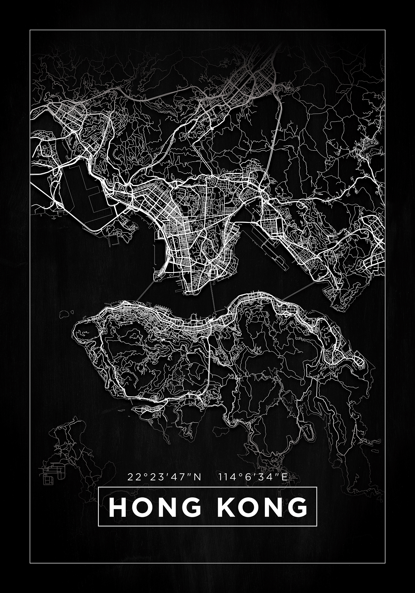 Qui abbiamo una mappa della città di Hong Kong che potrebbe essere il regalo perfetto per te o per qualcuno che tiene particolarmente a questa città! Le strade e le piazze sono stampate in bianco su uno sfondo nero. A nord e a sud, la mappa sfuma e in basso compare il nome Hong Kong in lettere maiuscole bianche. Sopra il nome, ci sono le coordinate geografiche della città. La mappa è circondata da una cornice simile al nome della città e all'esterno c'è un bordo nero più largo che aiuta a catturare l'attenzione e a focalizzare l'attenzione sul contenuto del quadro. Una bellissima cartina che attira l'attenzione!