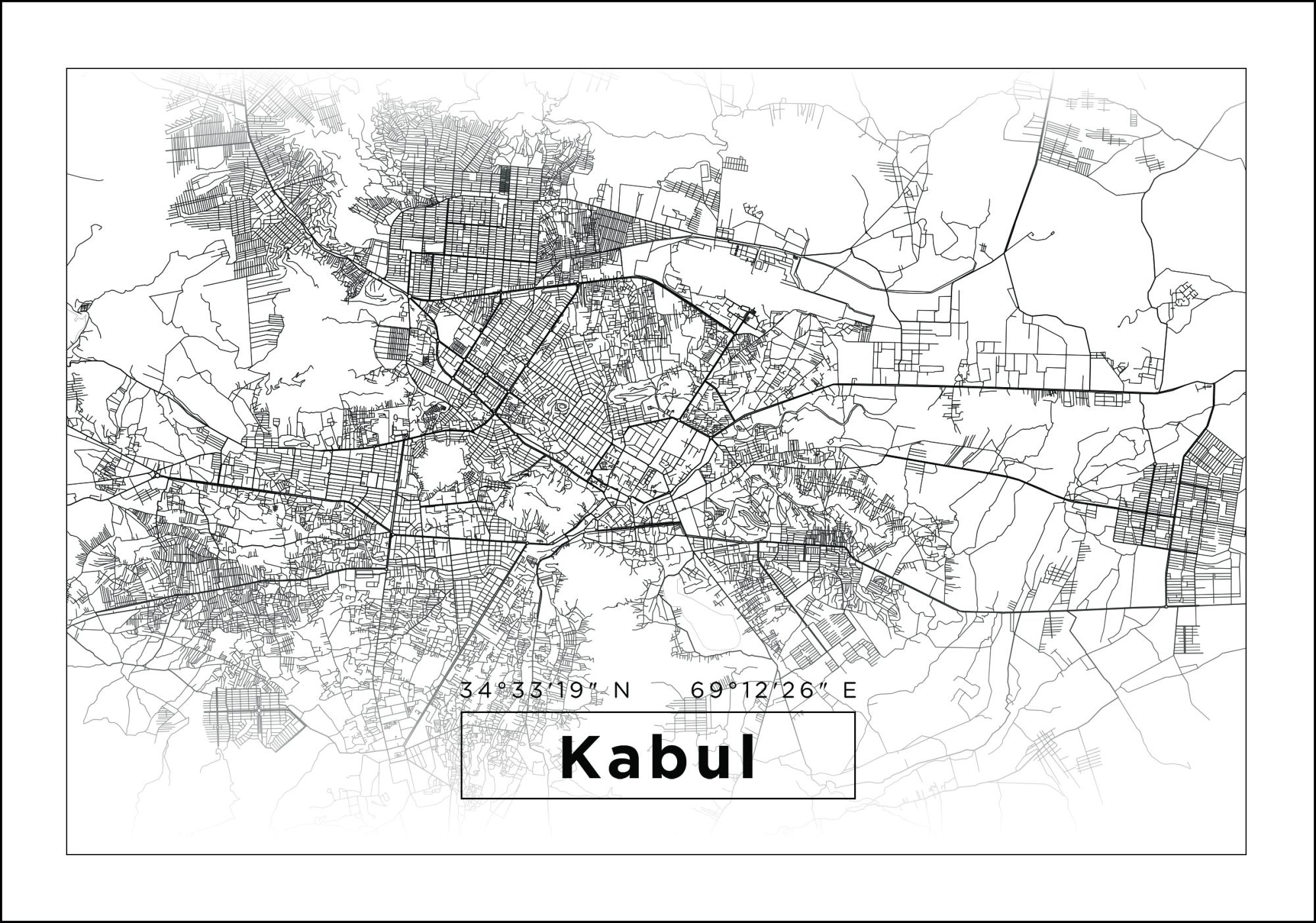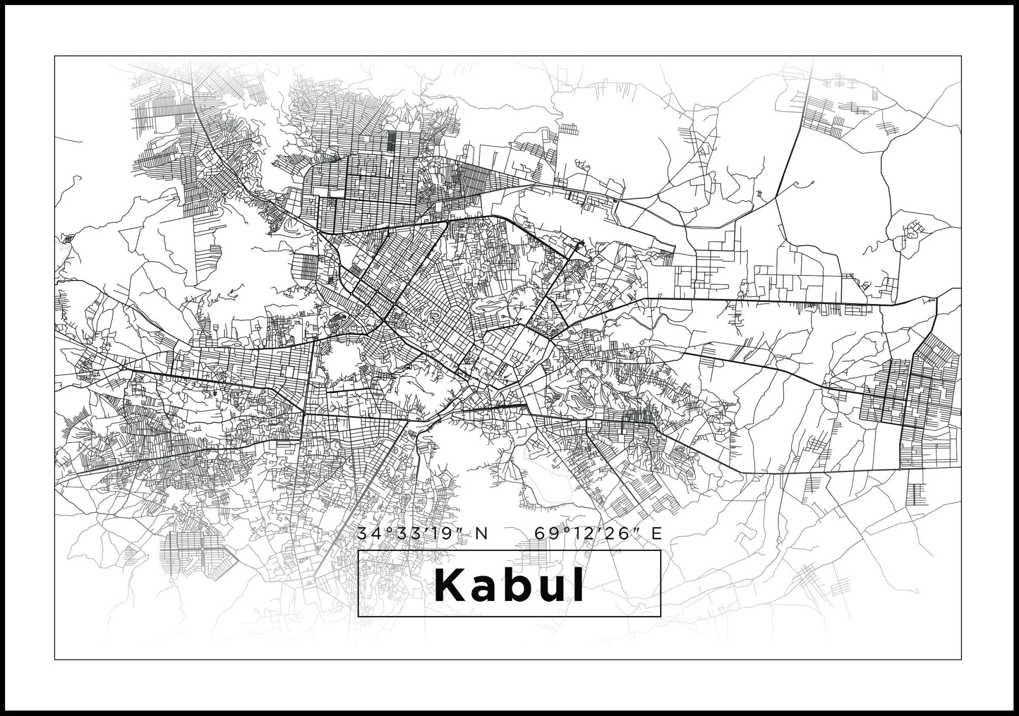 In questa mappa della città presentiamo Kabul in un formato orizzontale e elegante, in bianco e nero. In basso nell'immagine c'è Kabul incorniciata in nero e sopra ci sono le coordinate dell'area. La mappa della città è circondata da una cornice nera nello stesso stile del nome e all'esterno c'è un margine leggermente più ampio in bianco. Un poster per chi ama l'espressione elegante e raffinata nella propria casa!