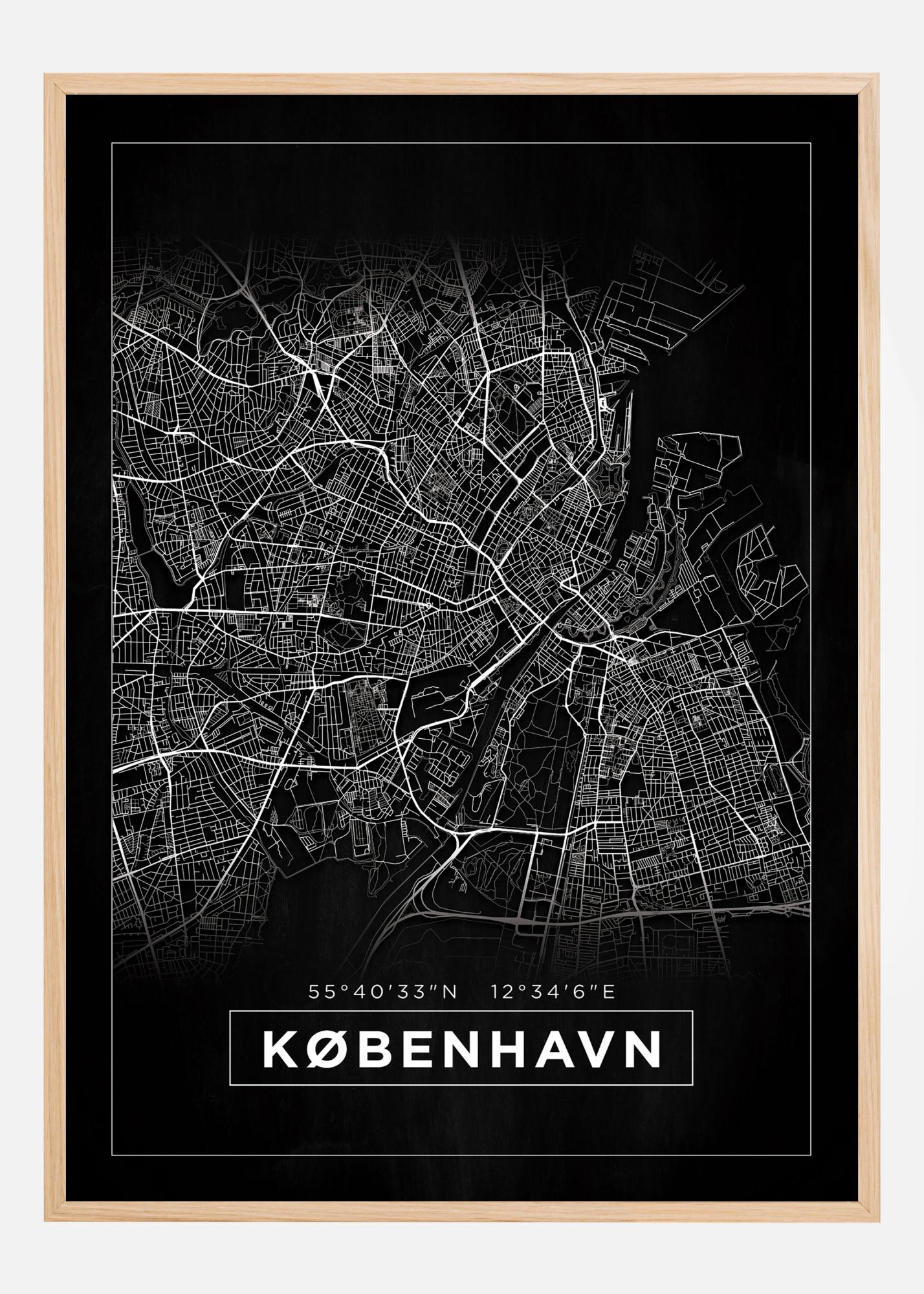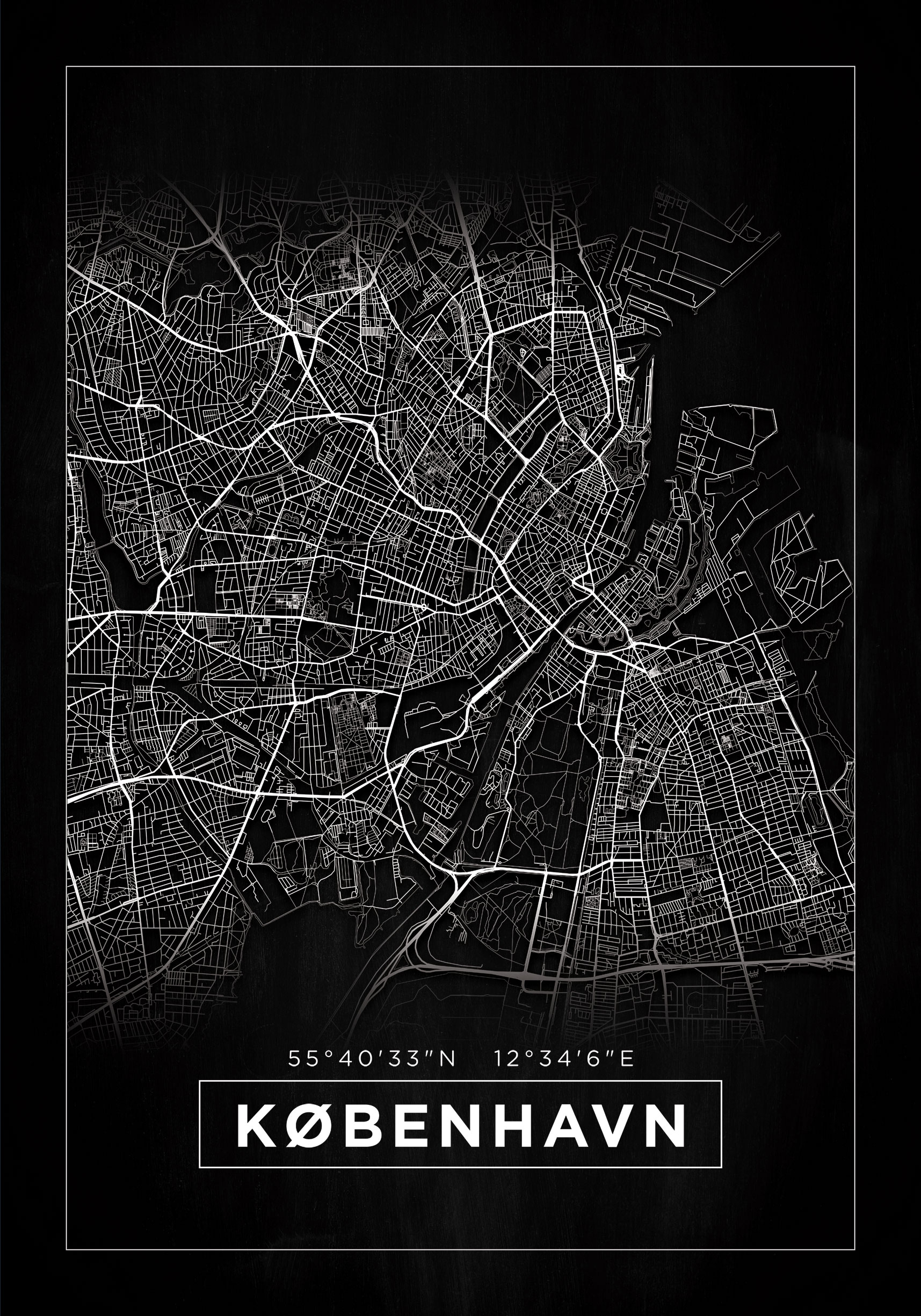 Ecco una mappa della città di Copenaghen davvero fantastica in bianco e nero. Qui vediamo l'intera rete stradale della città in un formato minimalista che si estende dal nord al sud. In alto e in basso, l'immagine della mappa si sfuma e le linee bianche scompaiono sullo sfondo nero. All'interno di un margine nero più ampio si trova una sottile cornice bianca. In basso nell'immagine c'è scritto Copenaghen con la corretta ortografia danese per dare la giusta sensazione e sopra ci sono le coordinate della città. La cornice bianca che circonda la mappa si trova anche intorno al nome della città. Questo poster della mappa crea contrasti davvero fantastici e conferisce un peso davvero piacevole al suo posto. Davvero un'attrazione per gli occhi!