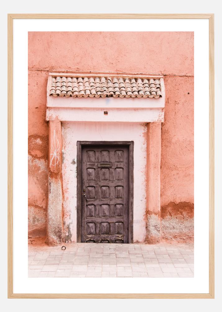 Una bellissima stampa color pesca e marrone di una porta di legno scuro. La casa marocchina è dipinta in una tonalità di pesca molto bella. Il muro bianco che circonda la porta aggiunge un tocco di luce al ritratto. Appendi questo bellissimo poster color pesca su una parete beige per creare una sensazione di armonia.