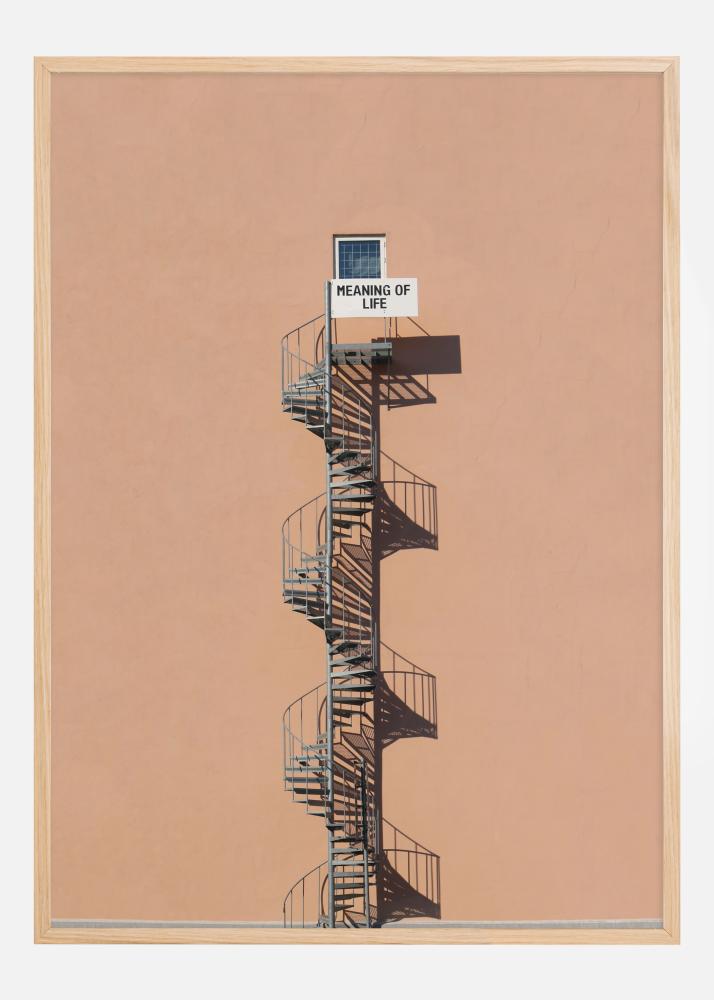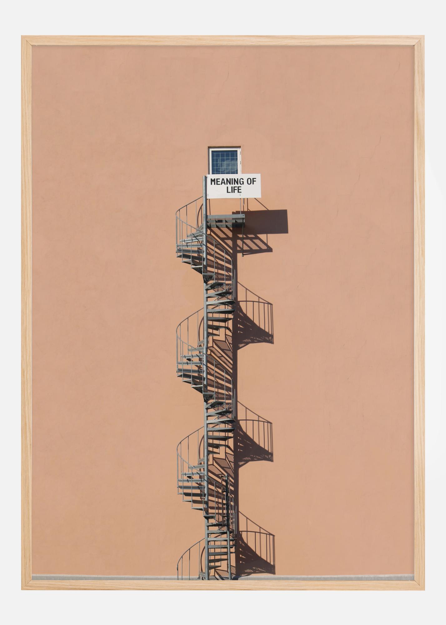Contro lo sfondo minimalista e uniformemente colorato, la scala si staglia come una struttura sia fisica che simbolica, dove ogni gradino può rappresentare un'esperienza, un apprendimento o un periodo della vita. La posizione dell'insegna in cima suggerisce che il significato della vita potrebbe essere qualcosa a cui aspiriamo costantemente, ma che forse non possiamo mai afferrare completamente o comprendere appieno.