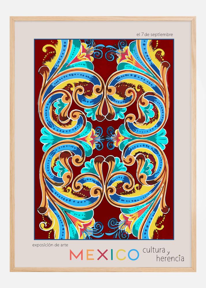 Il poster è un omaggio al ricco paesaggio culturale del Messico, e ogni dettaglio dell'illustrazione è progettato con cura per celebrare le tradizioni artistiche del paese. La semplice cornice in rovere completa i colori caldi e rende l'opera d'arte un'aggiunta ideale in tutti gli spazi che apprezzano la diversità culturale e l'energia artistica. Questo poster non è solo un invito a una mostra d'arte, ma anche un invito a vivere e apprezzare l'estetica e lo spirito unici del Messico.
