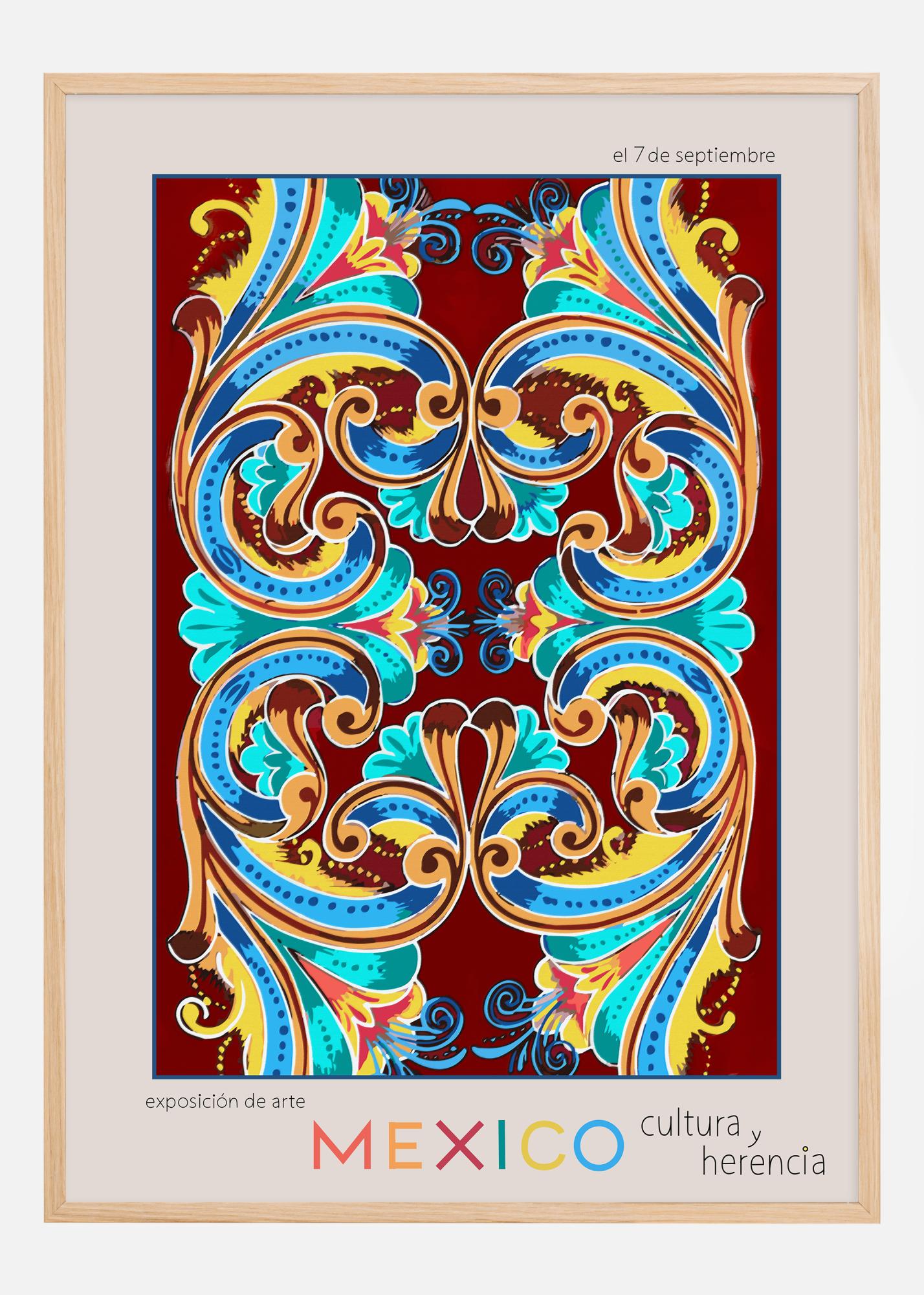 Questo poster vivace e colorato celebra una mostra d'arte in Messico. Il suo design è ispirato ai motivi tradizionali messicani, pieni di curve sinuose e motivi floreali esuberanti che invitano l'occhio a danzare sull'immagine. I ricchi colori rosso, giallo e blu sono tipici dell'arte popolare messicana e simboleggiano la cultura e il patrimonio della nazione con un tocco moderno.