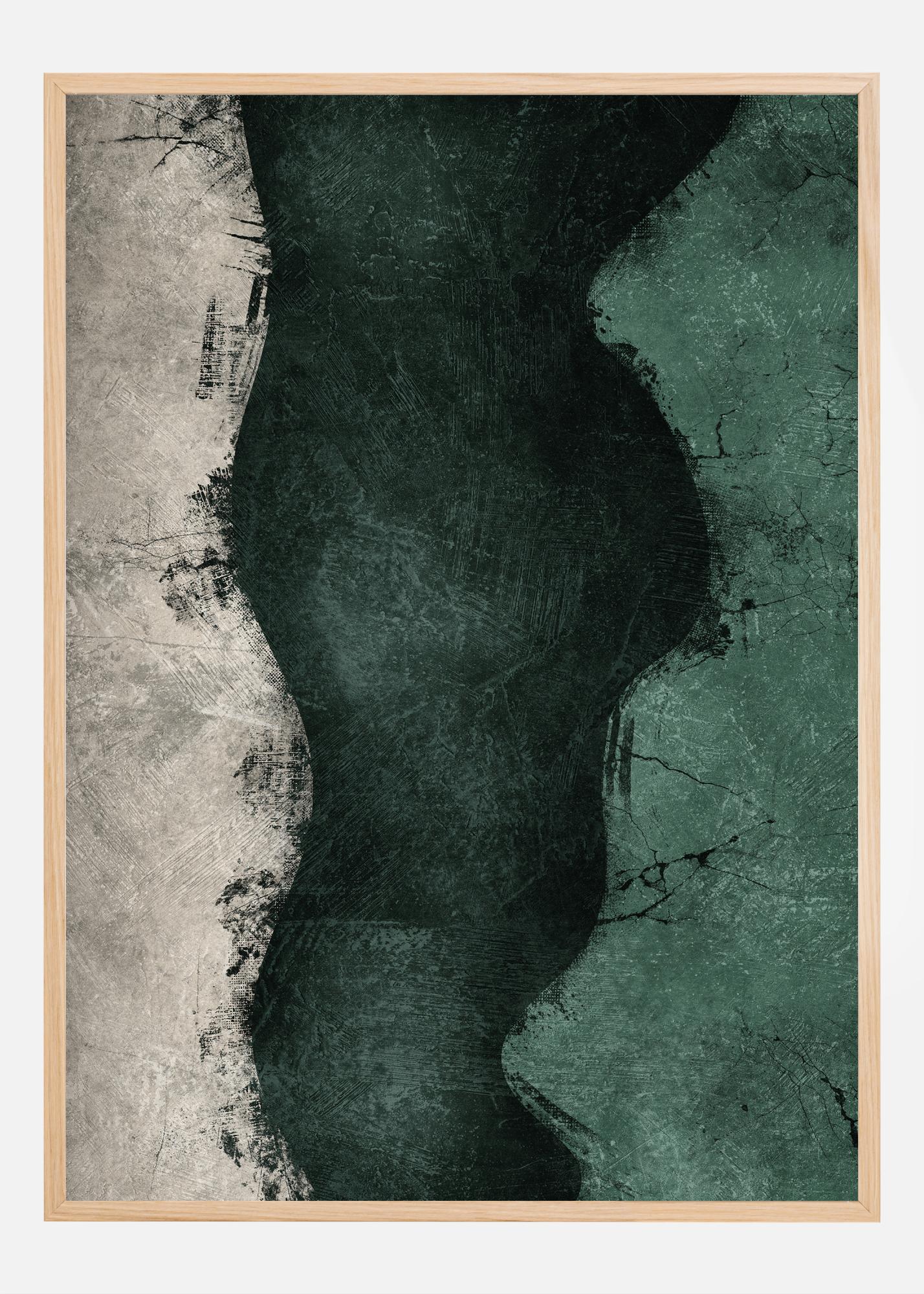 Questo poster offre un forte effetto visivo con la sua composizione divisa di forme testurizzate, simili a un'immagine aerea di un paesaggio scuro o una fessura tra due mondi. Un lato mostra una tonalità verde intensa con texture profonde, e l'altro una sfumatura più chiara e contrastante che insieme crea una sensazione del contrasto dinamico della natura tra foresta e terreno aperto. È un'immagine drammatica e affascinante che gioca con ombre e luci, creando una sensazione di mistero e fascinazione.