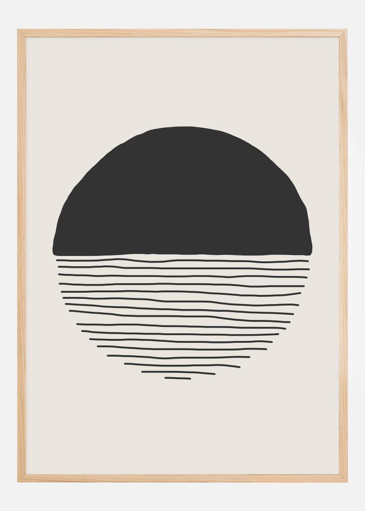 Questo poster è un omaggio alla purezza e alla potenza del design minimalista. Nel motivo, vediamo un semicerchio in nero profondo che sembra galleggiare sopra una serie di linee orizzontali nella stessa tonalità scura. Questo semplice ma audace contrasto con lo sfondo color crema crea un forte effetto visivo. È perfetto per dare un'impressione moderna e sofisticata in uno spazio che valorizza un design rigoroso e elementi grafici forti.