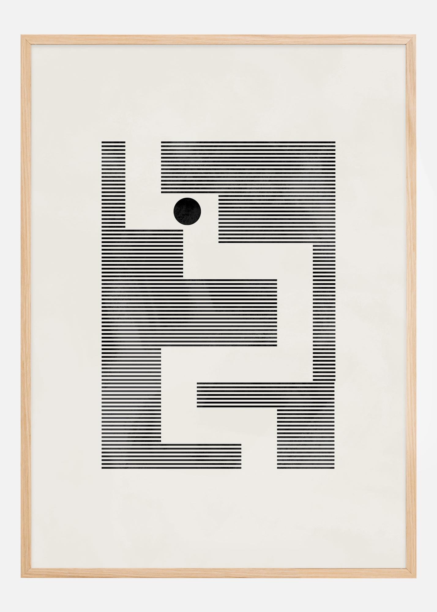 Questo poster artistico offre un'interpretazione minimalista di un labirinto, realizzato con linee nere che formano una intricata trama di forme geometriche su uno sfondo color crema. L'unico cerchio nero posizionato al centro del labirinto funge da punto di ancoraggio visivo, conferendo profondità e concentrazione al motivo altrimenti semplice. Questo design gioca con l'occhio dell'osservatore e incoraggia un'esplorazione visiva dei suoi percorsi e vicoli ciechi.