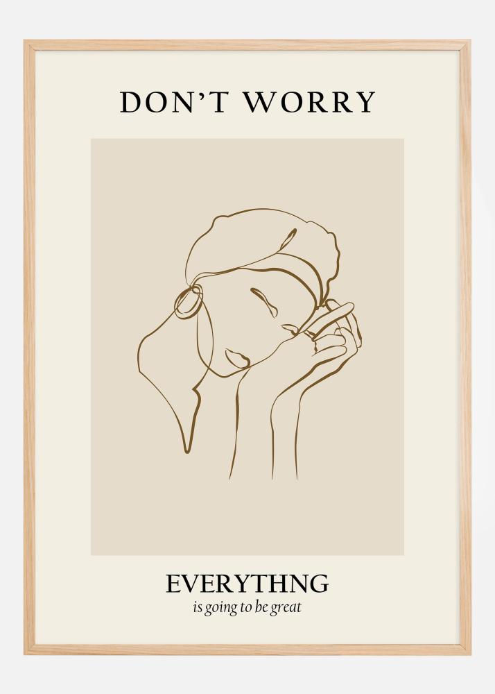 Questo poster artistico cattura un momento di riflessione e pace interiore attraverso un disegno a linee di una persona che tiene la mano sul viso. Il testo "DON'T WORRY" in lettere maiuscole sovrasta l'immagine e fornisce un promemoria calmante, mentre "EVERYTHING is going to be great" sottolinea il messaggio con un tono più riflessivo. Questa opera d'arte moderna è perfetta per creare un senso di calma e ottimismo a casa o in ufficio.