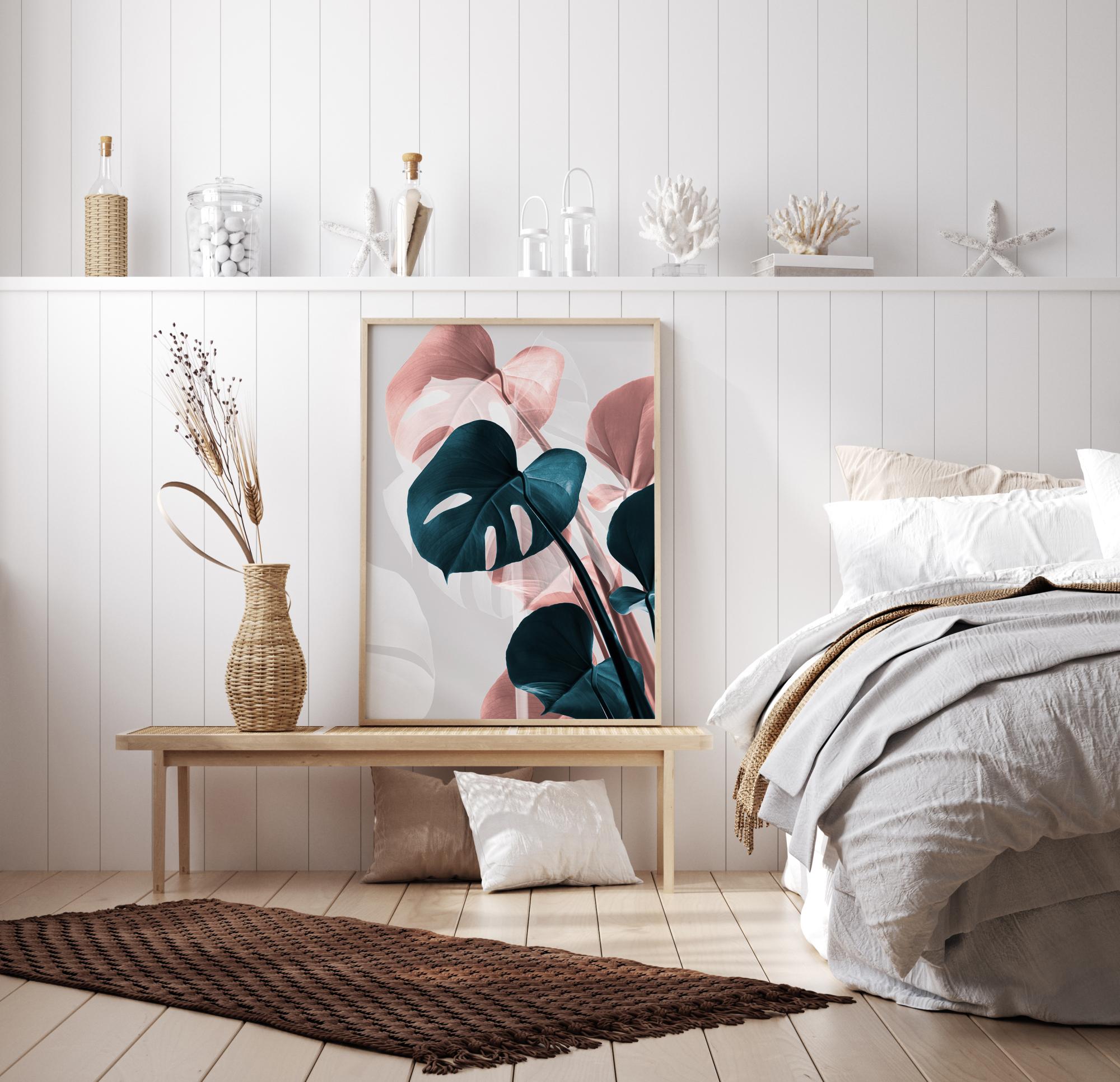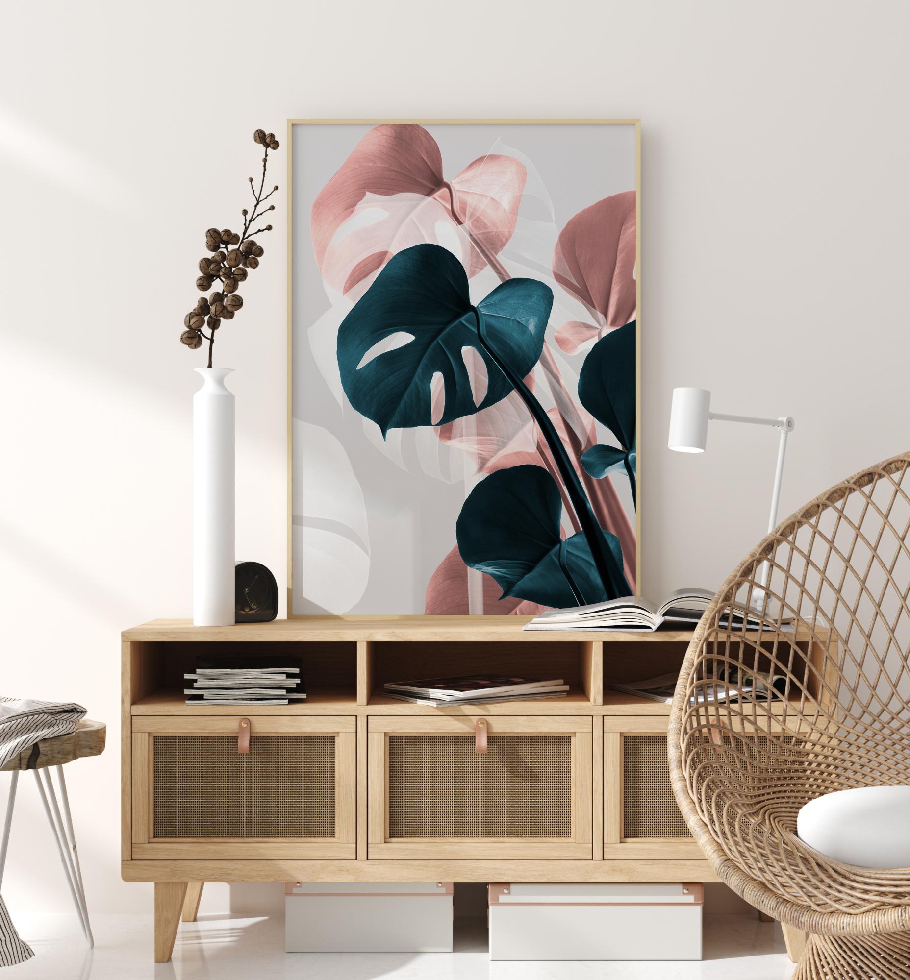 Un bellissimo poster con foglie di monstera rosa e verde scuro che mostrano la perfetta creatività delle foglie. Su uno sfondo color beige, le foglie a forma di cuore brillano con i loro bellissimi colori verde e rosa. I motivi a forma di foglia donano una sensazione emozionante alla tua casa.