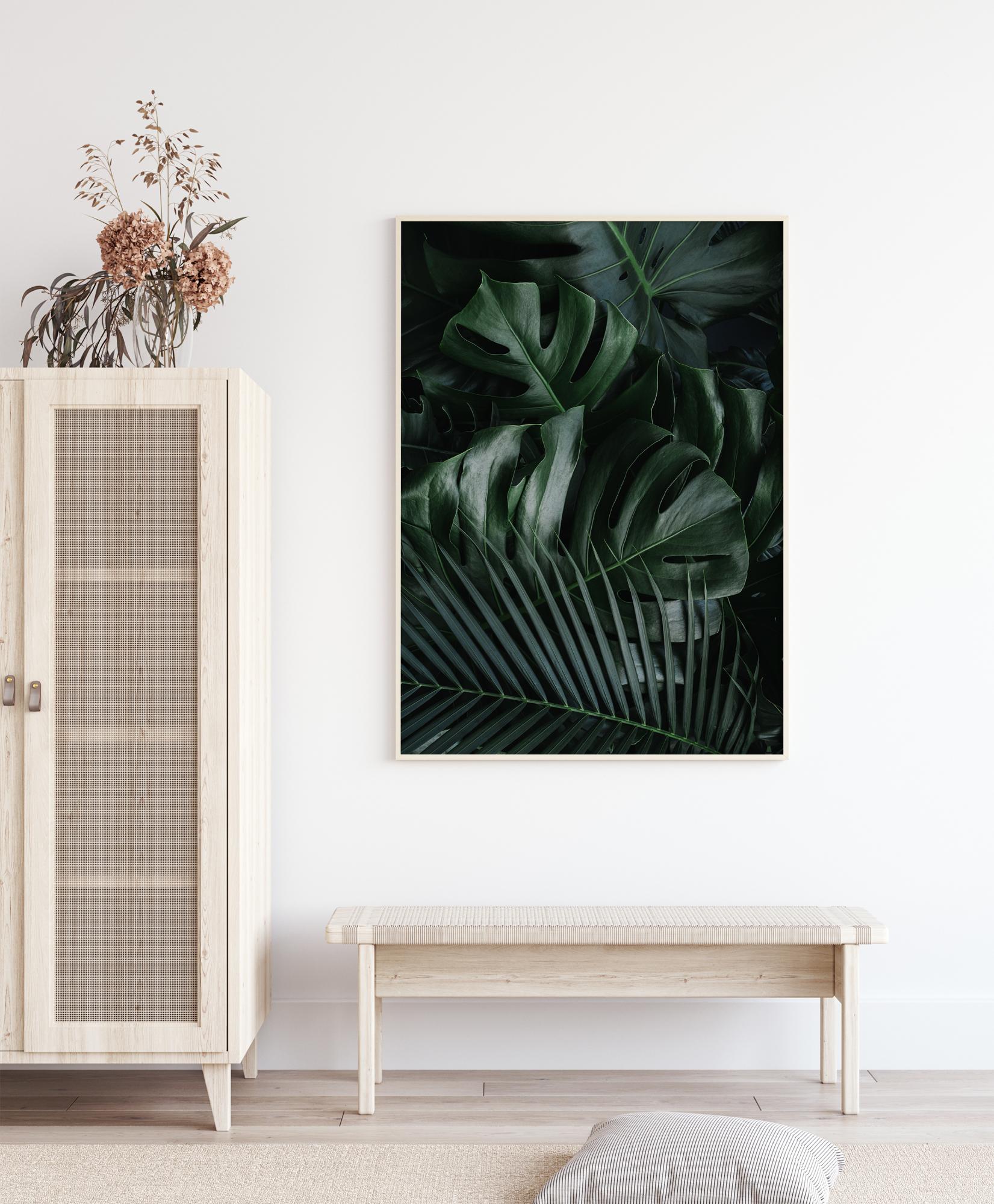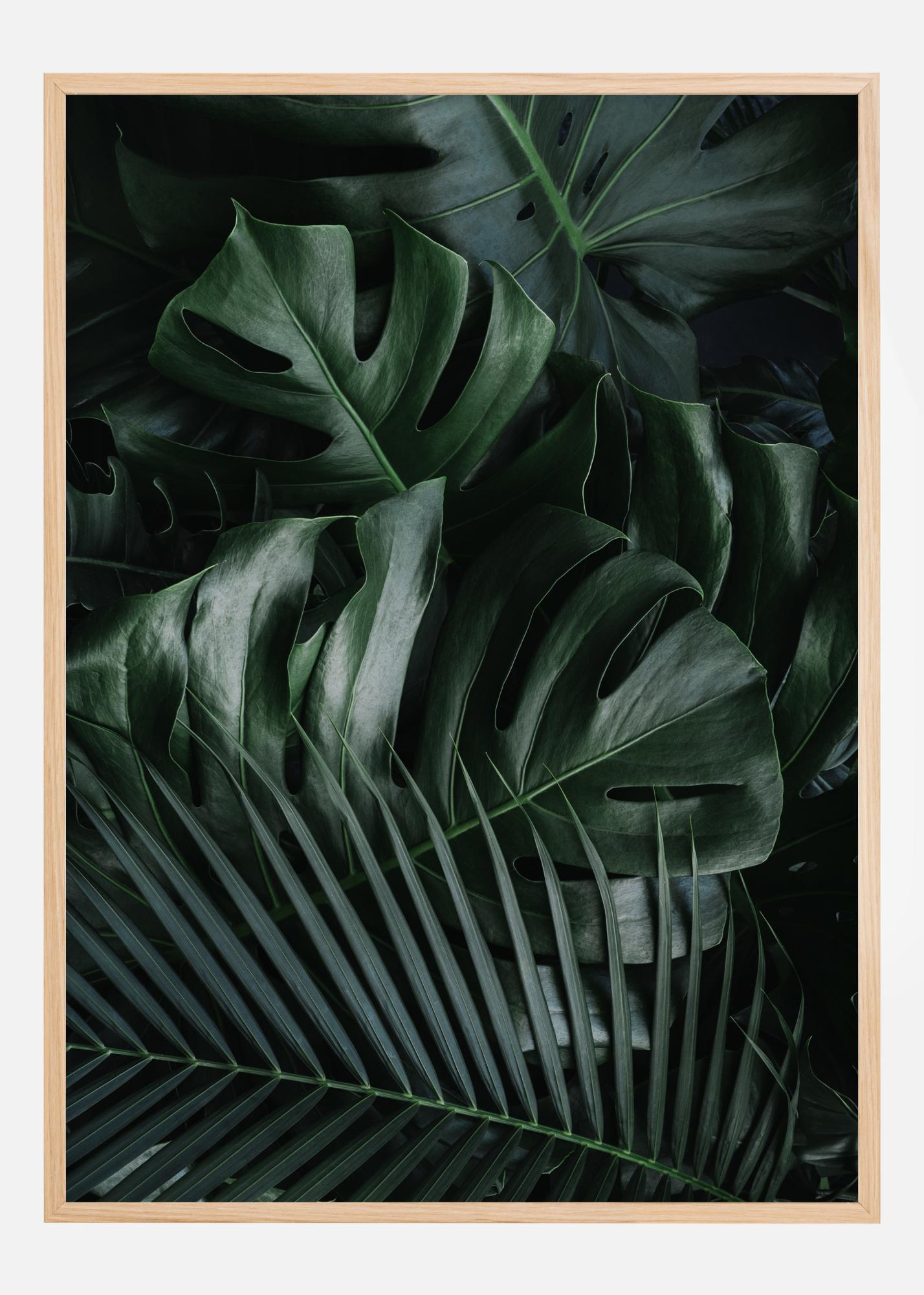 Un ritratto lussureggiante di foglie verdi di Monstera e palma. La luce naturale illumina le foglie superiori di Monstera e crea tonalità più scure nella parte superiore della stampa. Le foglie a forma di sega creano una sensazione calda e rilassante. Un poster perfetto per tutti gli amanti delle piante.