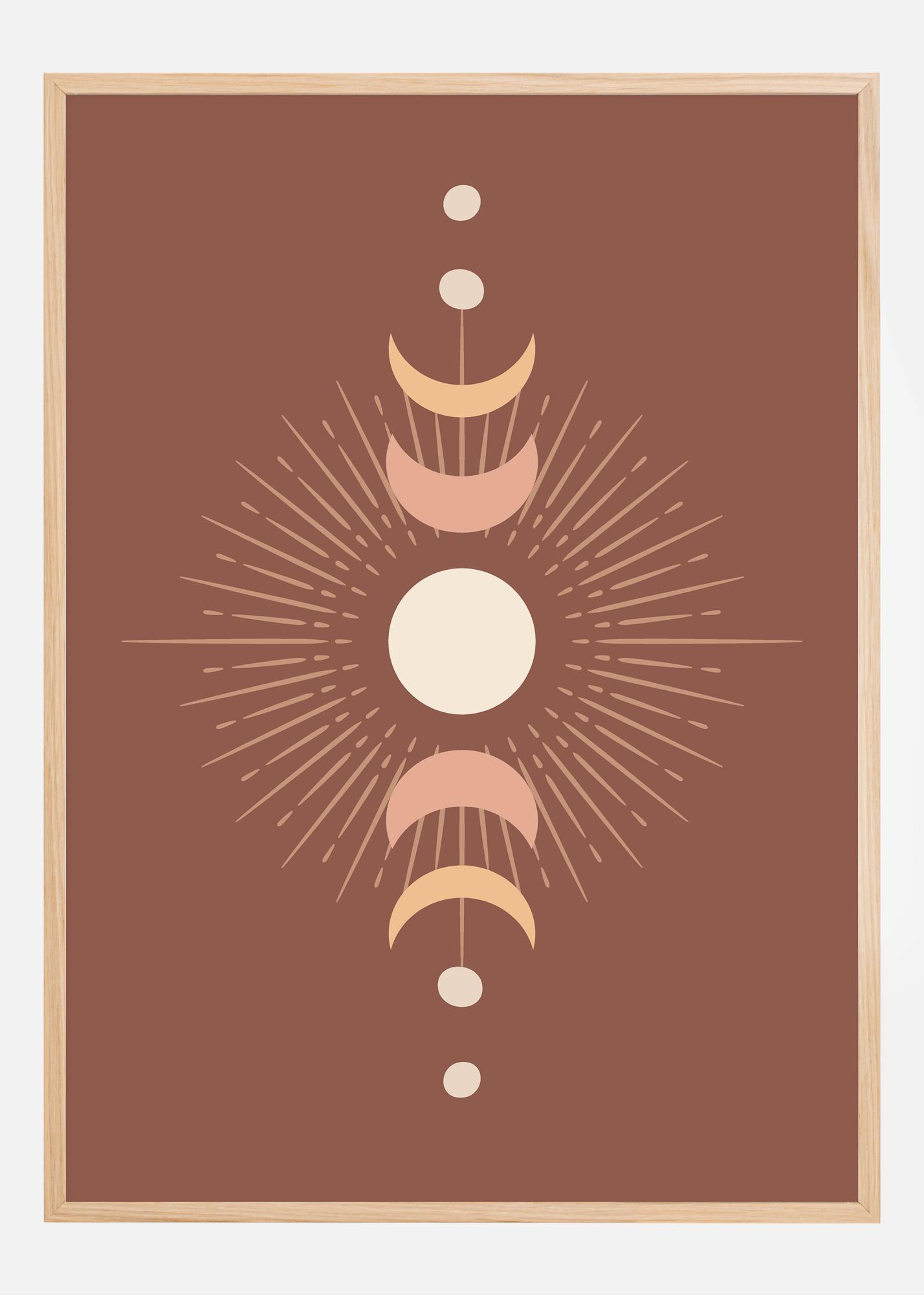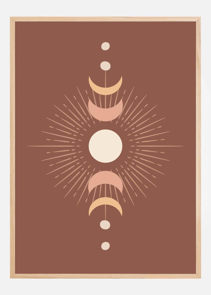 Questo elegante poster, che rappresenta le diverse fasi della luna contro uno sfondo profondo e stimolante, offre un senso di armonia cosmica e bellezza senza tempo. Le fasi lunari delicatamente delineate, disposte centralmente con il sole splendente in basso, sono un promemoria del nostro posto nel contesto più ampio dell'universo. La sua colorazione calda in tonalità terrose crea un'atmosfera rilassante e accogliente.