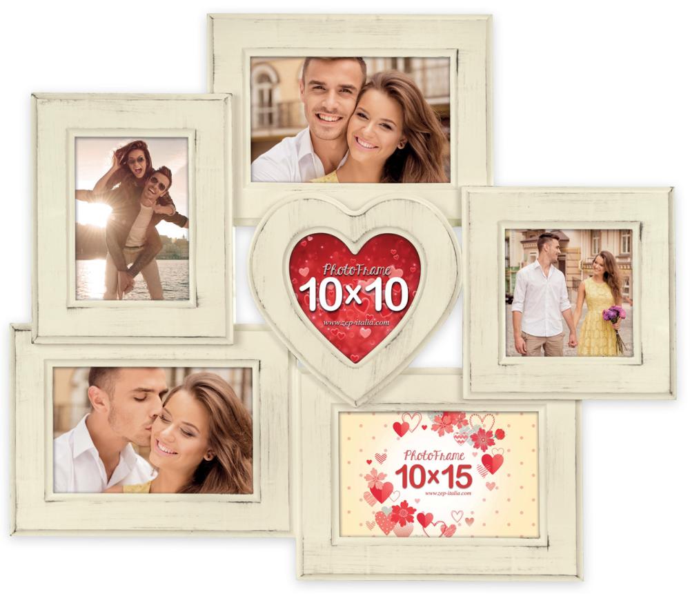 Questa è una bella cornice multipla con un design romantico. Al centro c'è una cornice a forma di cuore che è elegantemente incorniciata da altre cornici sia in formato verticale che orizzontale. La foto che sceglierai di inserire lì diventerà davvero il punto focale del quadro! Questa cornice ti offre la possibilità di incorniciare 6 diverse immagini di dimensioni 9x13 cm, 10x10 cm e 10x15 cm. questa cornice multipla è di un bel colore crema ed è realizzato in composito. Include un supporto da parete.