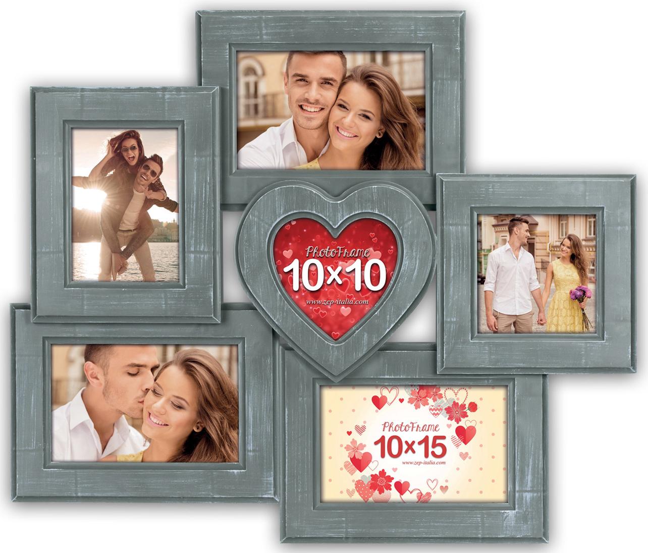 Questa è una bella cornice multipla con un design romantico. Al centro c'è una cornice a forma di cuore che è elegantemente incorniciata da altre cornici sia in formato verticale che orizzontale. La foto che sceglierai di inserire lì diventerà davvero il punto focale del quadro! Questa cornice ti offre la possibilità di incorniciare 6 diverse immagini di dimensioni 9x13 cm, 10x10 cm e 10x15 cm. questa cornice multipla è realizzato in una bella tonalità di grigio ed è realizzato in composito. Supporto da parete incluso.