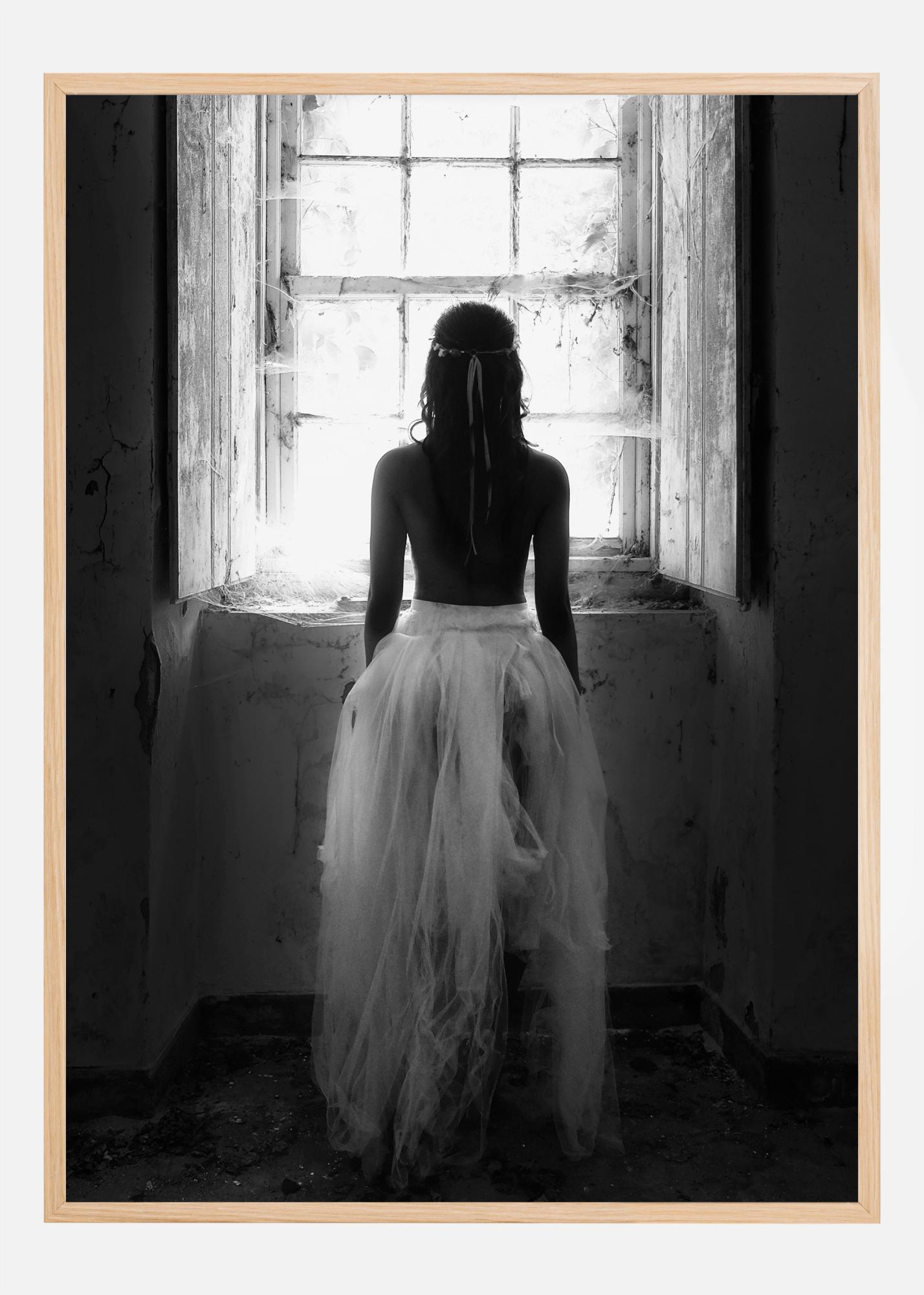 Una bellissima foto in bianco e nero di una donna seminuda che si trova vicino a una vecchia finestra. La finestra sporca è coperta di ragnatele e la donna guarda fuori dalla finestra. Vestita con una gonna di tulle bianca, la giovane donna sembra essere profondamente immersa nei suoi pensieri. Un poster perfetto da appendere in una camera da letto.