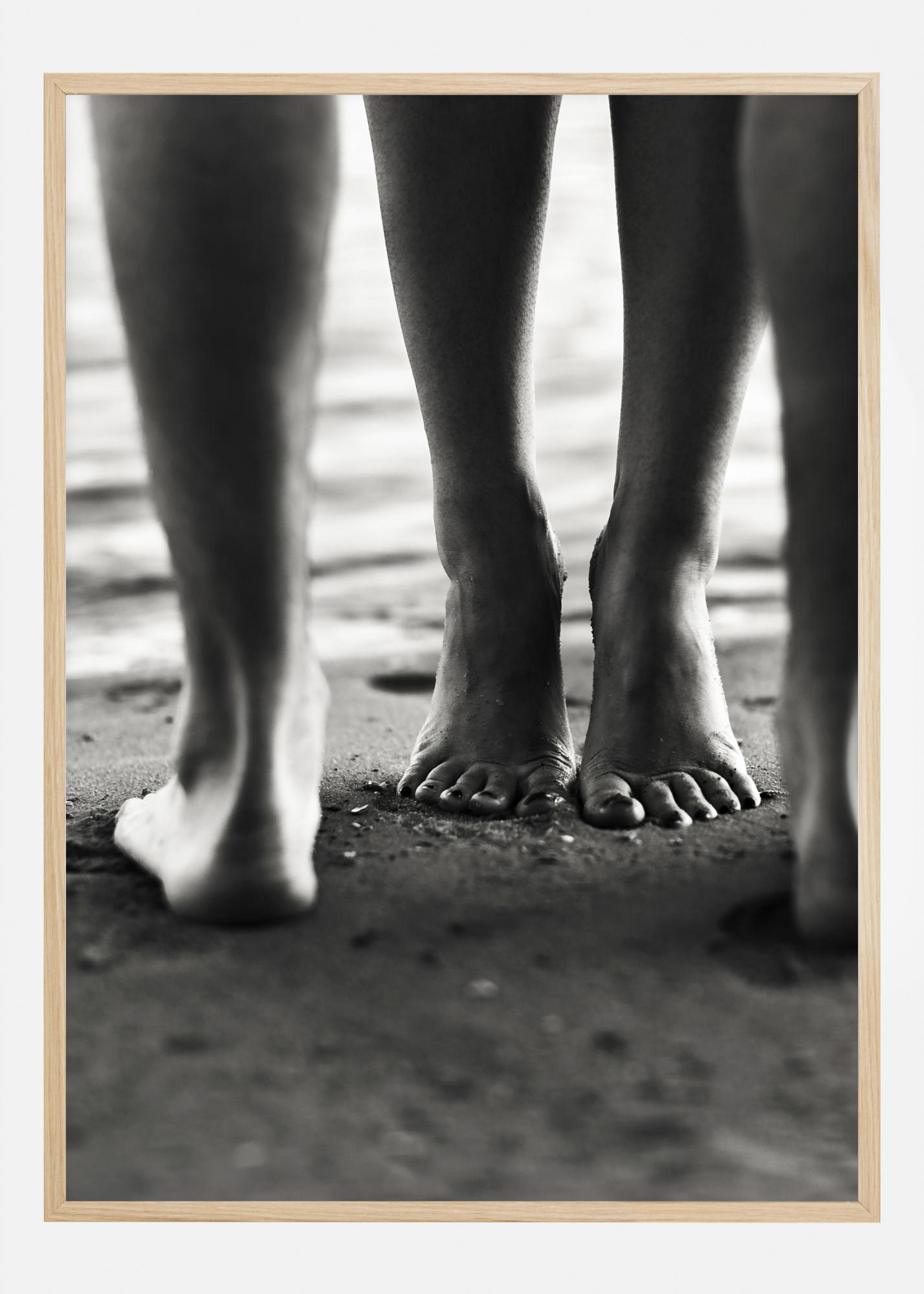 Un poster romantico con un primo piano in bianco e nero di quattro gambe su una spiaggia. L'immagine raffigura due persone che si guardano l'un l'altra. Lo sguardo si ferma facilmente sulla figura che sta in punta di verticale. Questa bellissima stampa dona una sensazione romantica e si adatta alla tua camera da letto quando desideri un tocco di romanticismo.