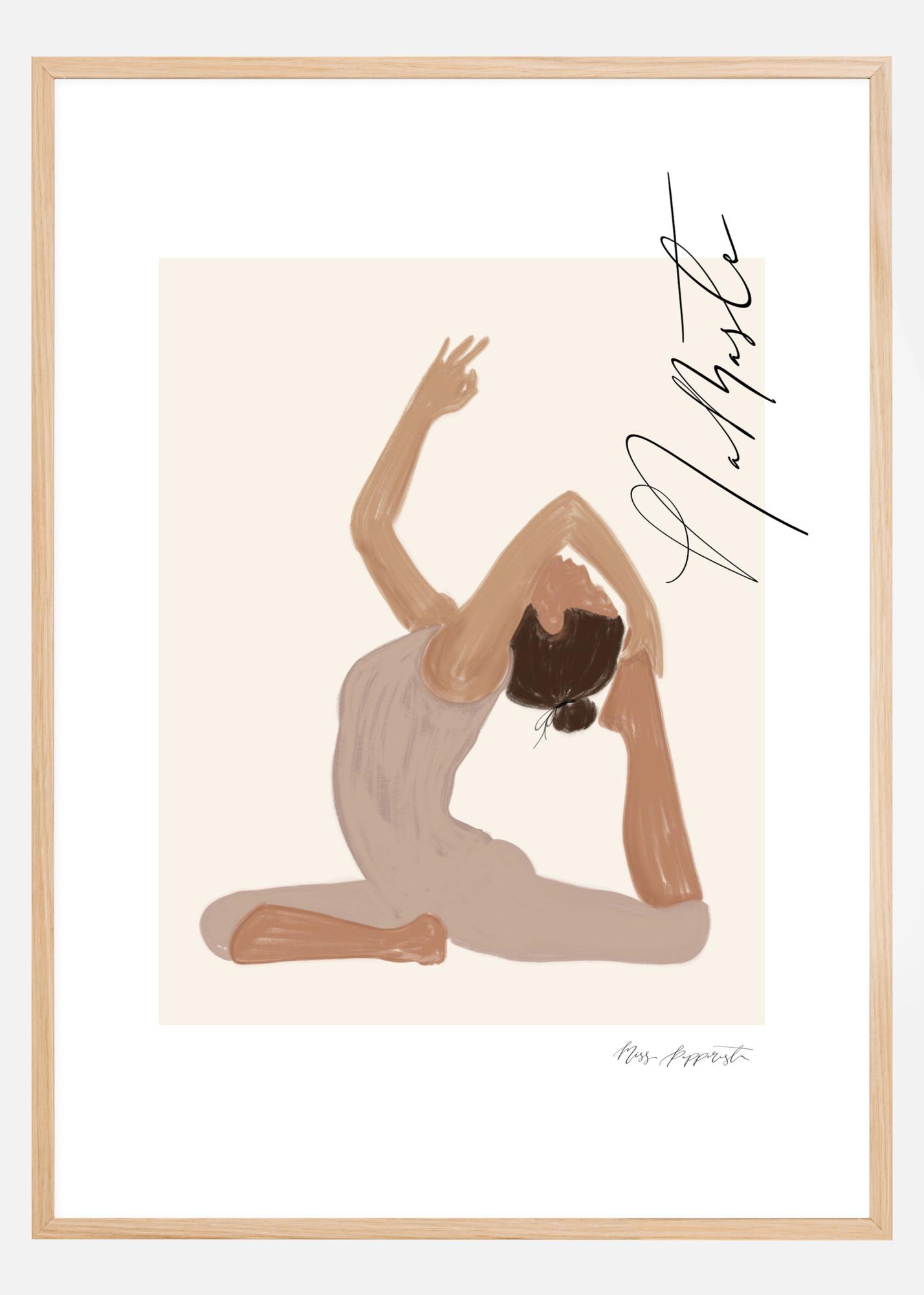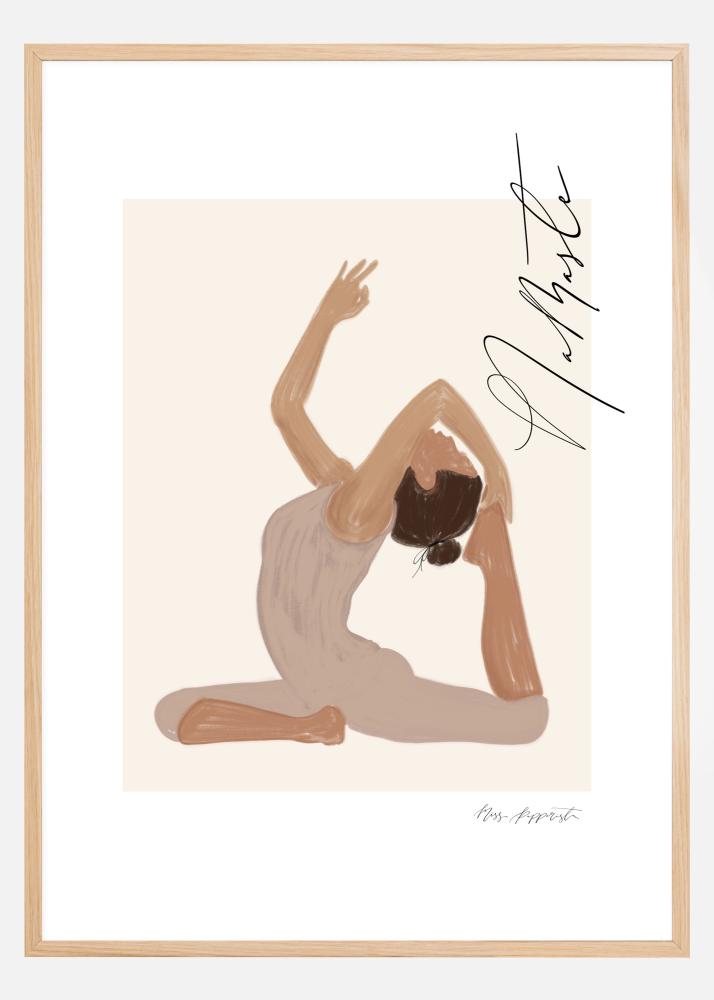 Un poster grafico dai toni pastello, raffigurante una donna in posizione yoga insieme al messaggio "Namaste" (Ti saluto) in una bellissima calligrafia. Un motivo armonioso e tranquillo incorniciato e messo in risalto da un passe-partout più ampio in bianco, creato da Jenny Skantz, Miss Papperista.