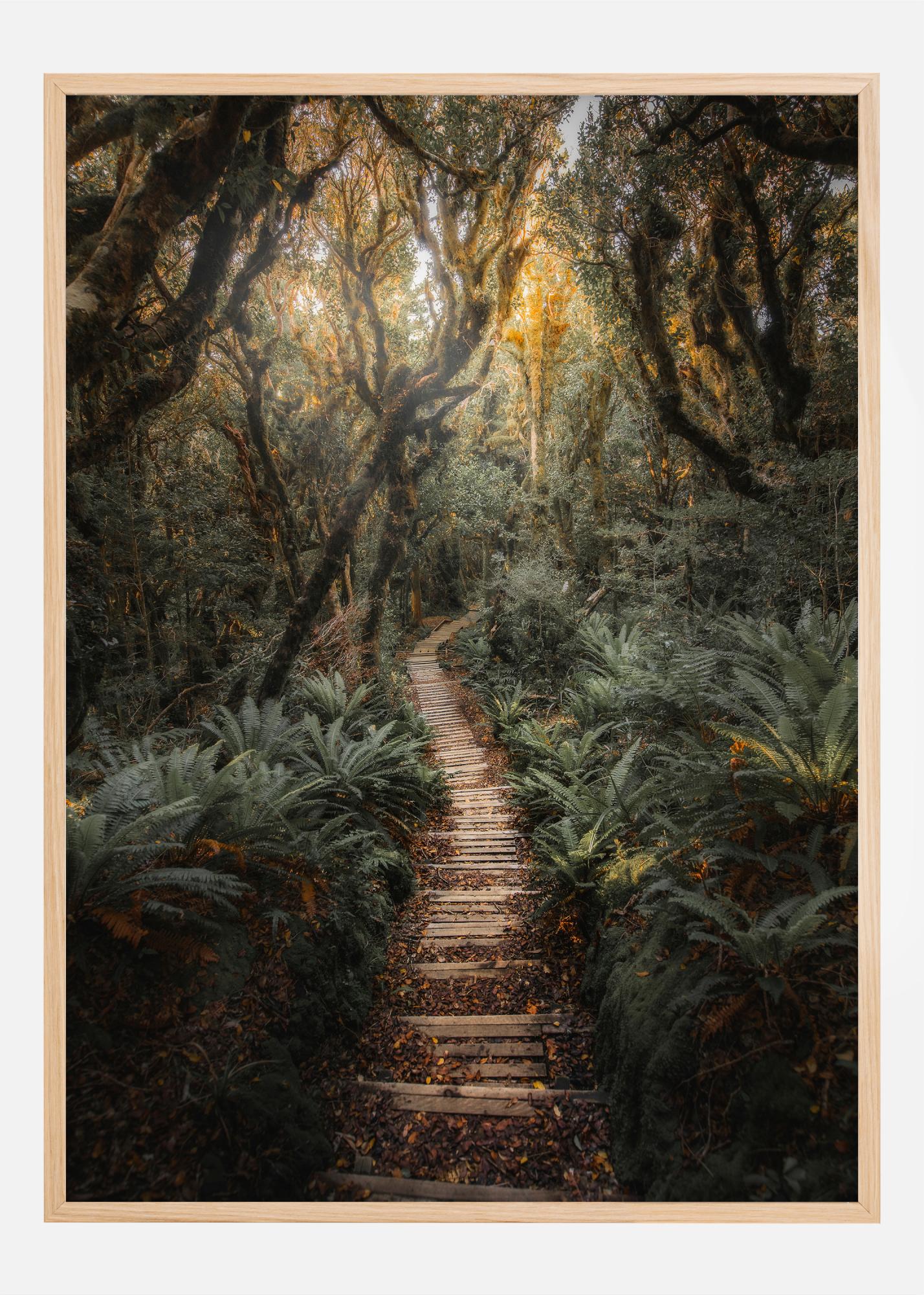 Esplora il regno incantato della natura con questo coinvolgente poster che cattura un sentiero misterioso che si snoda attraverso un'antica foresta. Questa stampa da vita a un mondo dove il tempo sembra essersi fermato, dove gli alberi contorti vestiti di muschio e felci in rigogliose sfumature verdi incorniciano uno stretto sentiero di assi di legno. I raggi del sole si fanno strada attraverso il fogliame, creando un bagliore magico che mette in risalto la bellezza della foresta e la profondità della sua silenziosa sala di foglie. Questo poster non è solo un'immagine; è un invito a camminare attraverso i sentieri del pensiero e scoprire l'ignoto.