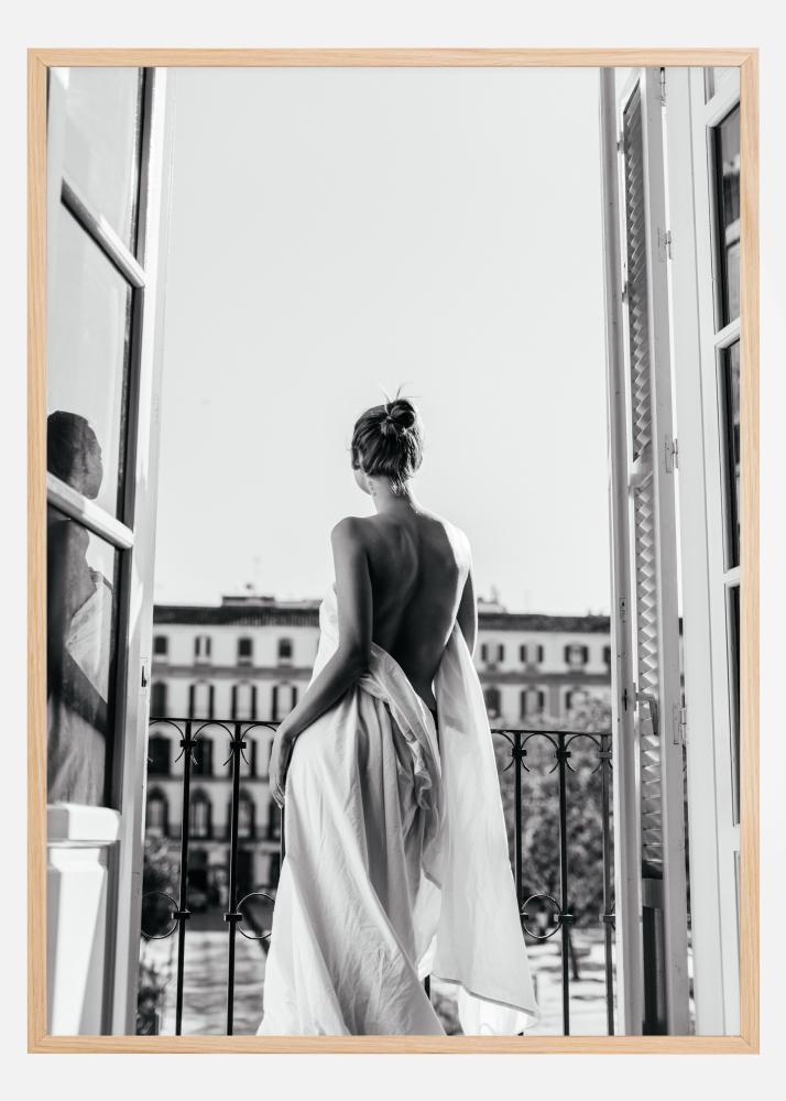Un poster in bianco e nero sexy con un primo piano di una donna che si trova su un balcone con un asciugamano bianco. Con i capelli legati in un nodo, la donna sembra ammirare la vista. Il riflesso della donna nella finestra crea un'impressione sensuale. Questa è un'immagine sensuale e bella da appendere alla parete della tua camera da letto.