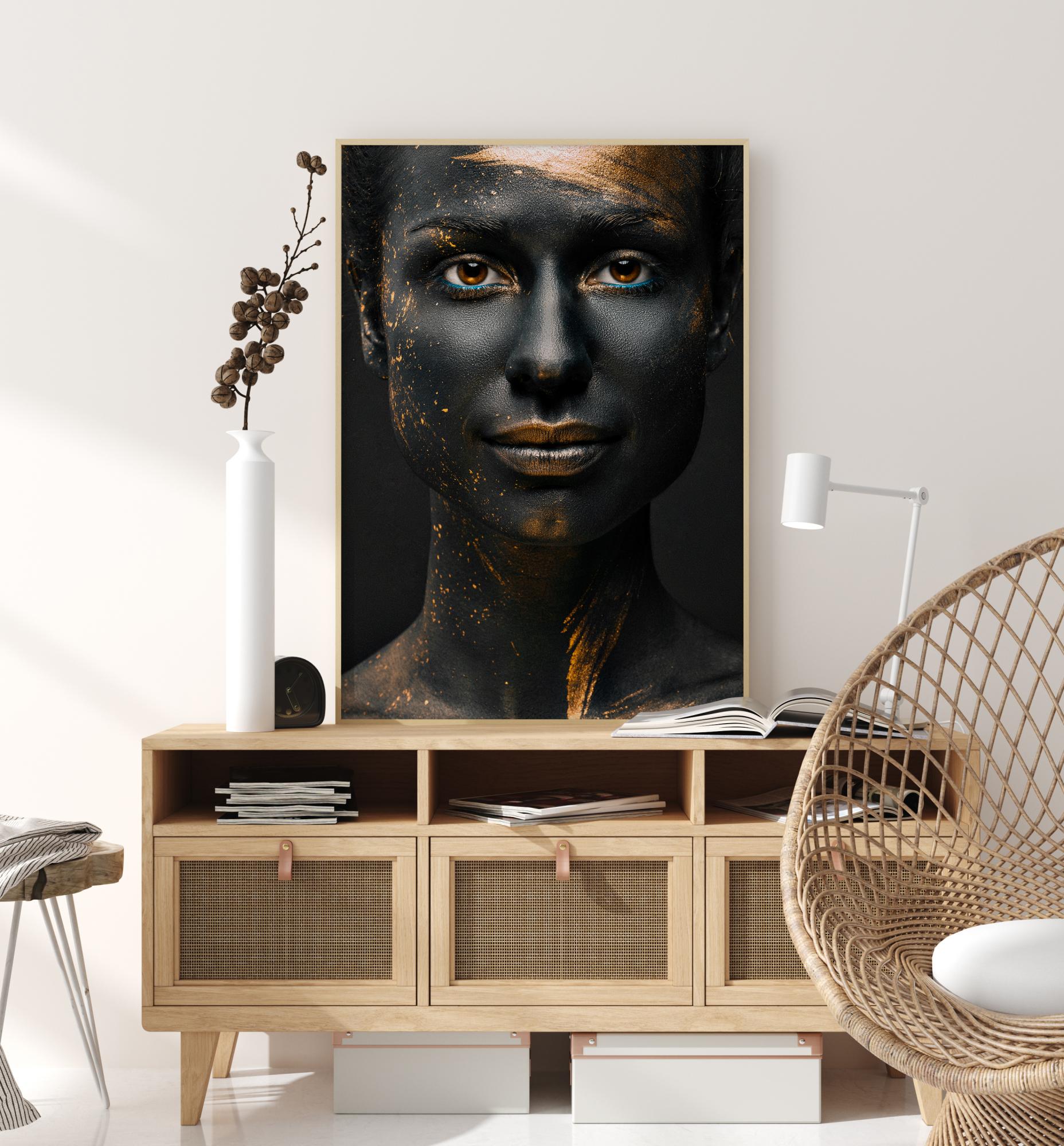 Un poster ritratto in bianco e nero che raffigura una donna sorridente con il viso dipinto di grigio. Il viso della donna è stato spruzzato con vernice dorata sulla fronte, sulle labbra e sul collo. Gli occhi della donna, che guardano dritti verso la fotocamera, sono stati evidenziati con eyeliner blu che crea uno sguardo intenso. Questa bellissima stampa mostra un'immagine di bellezza perfetta che illuminerà la tua casa.