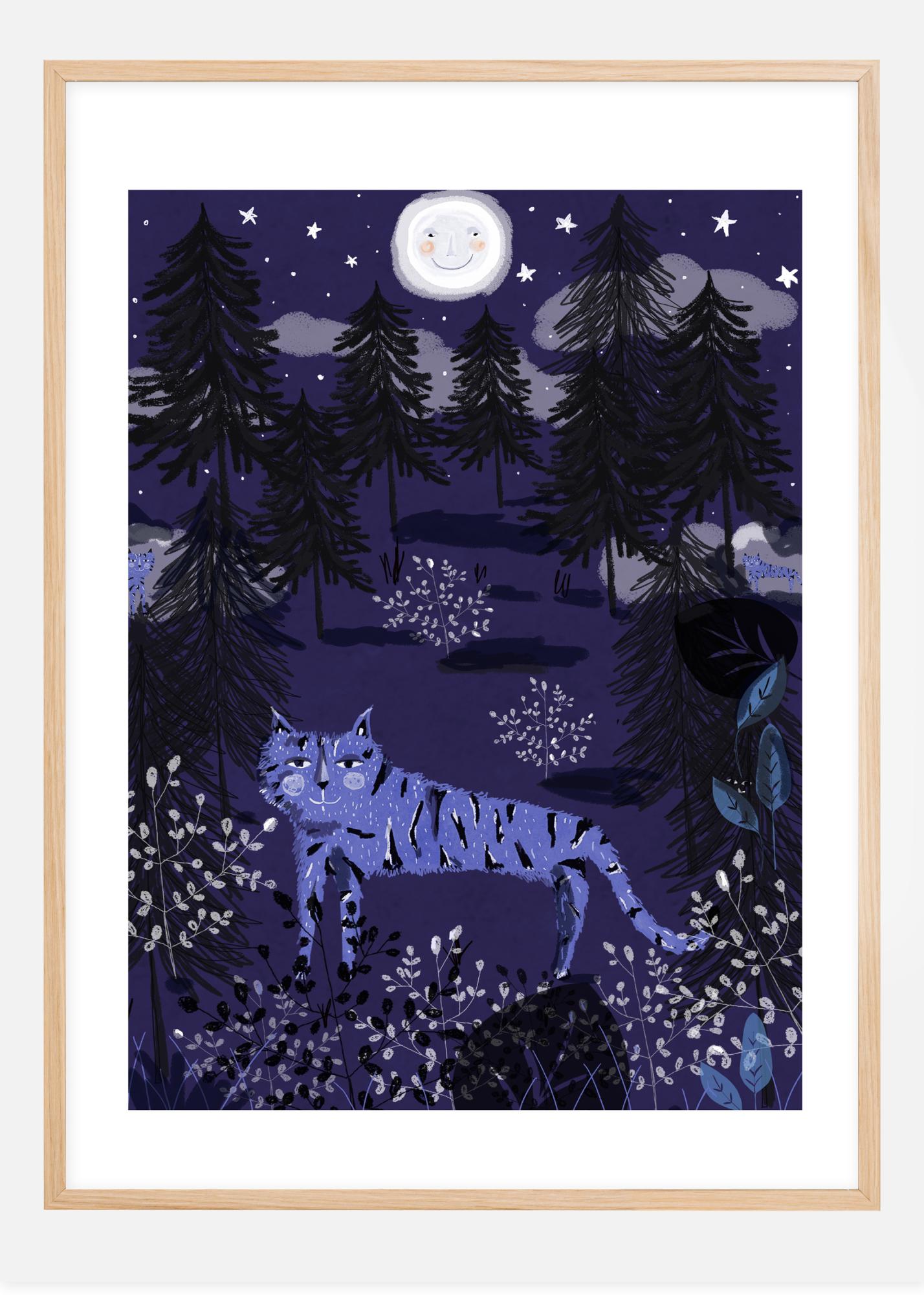 Un poster divertente che mostra una foresta di notte con una luna sorridente e una tigre. Il cielo viola è pieno di nuvole e stelle scintillanti. Sullo sfondo gli alberi alti si ergono mentre la luna li guarda dall'alto. I colori viola scuro e verde creano una sensazione calda, mentre i piccoli cespugli bianchi danno alla stampa quella luce extra. Un'immagine perfetta per la stanza dei bambini.